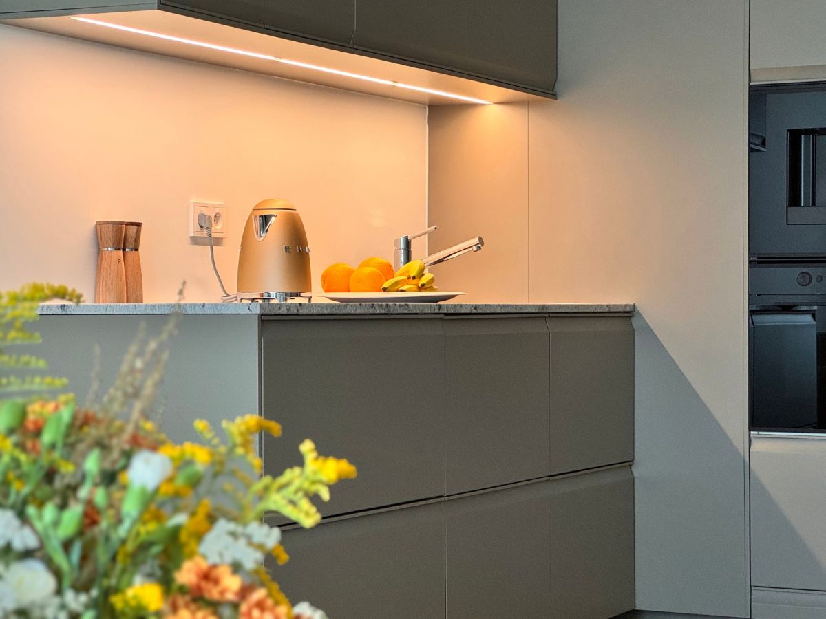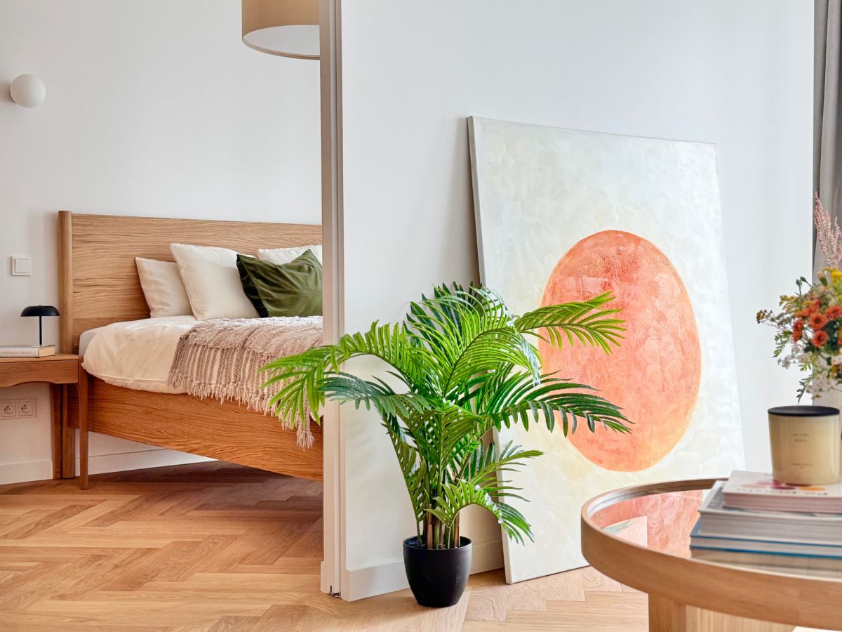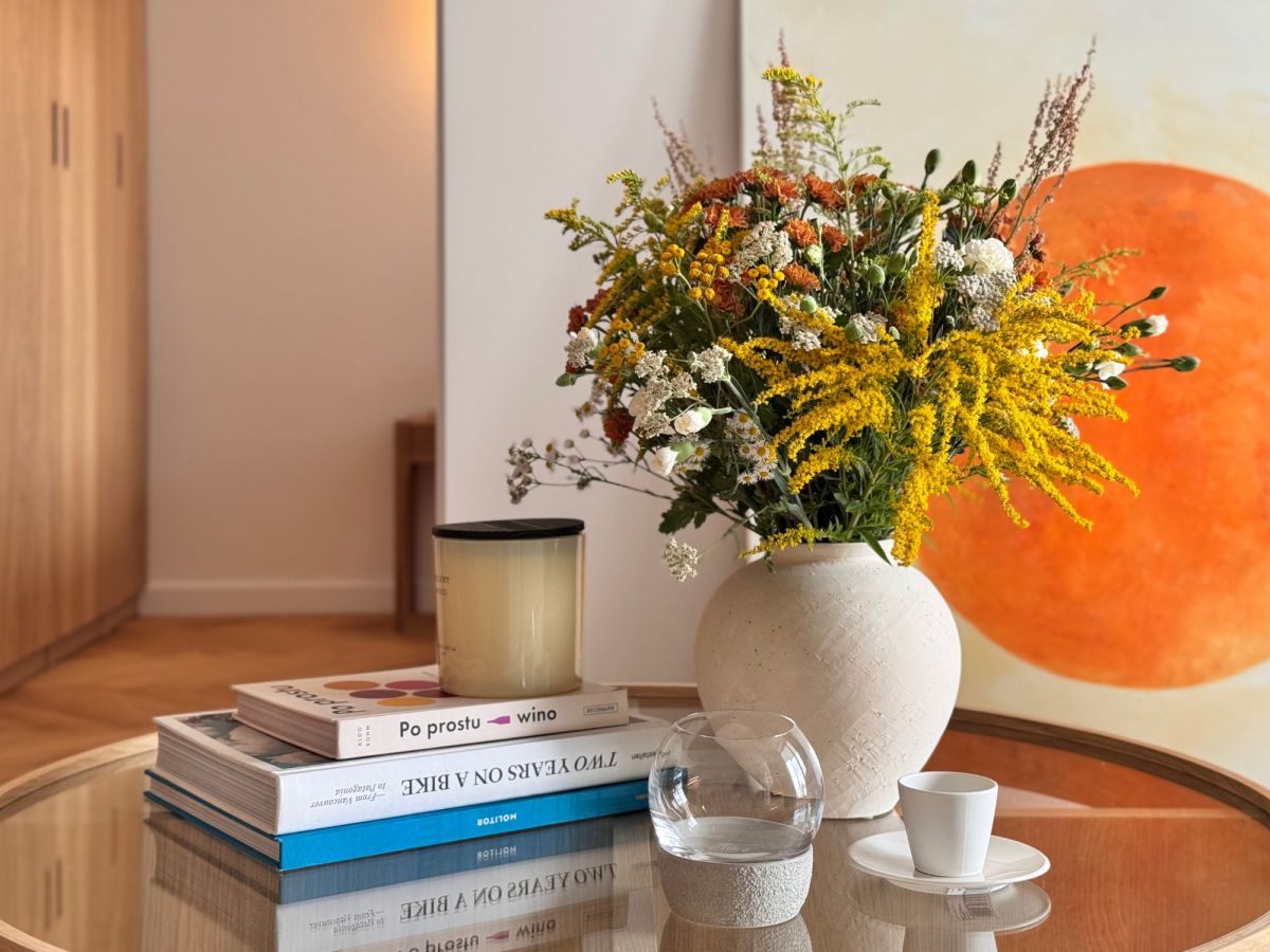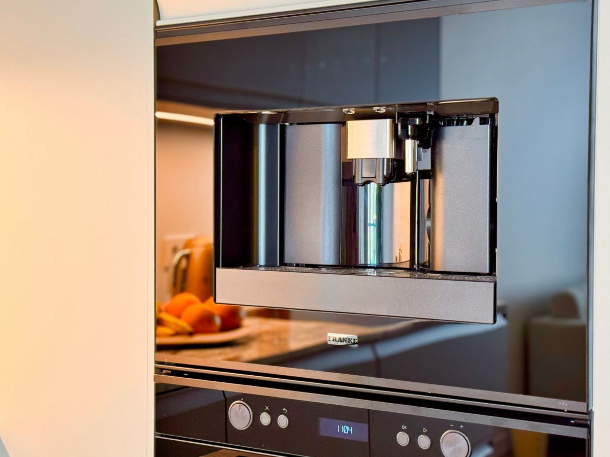 W mieszkaniu zastosowano wysokiej klasy materiały: naturalną podłogę z woskowanego dębu, klimatyzację Mitsubishi w dwóch pomieszczeniach, zabudowę stolarską na wymiar oraz kompletną, nowoczesną kuchnię wykończoną sprzętem Franke (płyta indukcyjna z wyciągiem, piekarnik, lodówka, zmywarka, ekspres). Całość dopełniają designerskie lampy, harmonijna kolorystyka i armatura Villeroy & Boch / Grohe, tworząc atmosferę komfortu i elegancji.