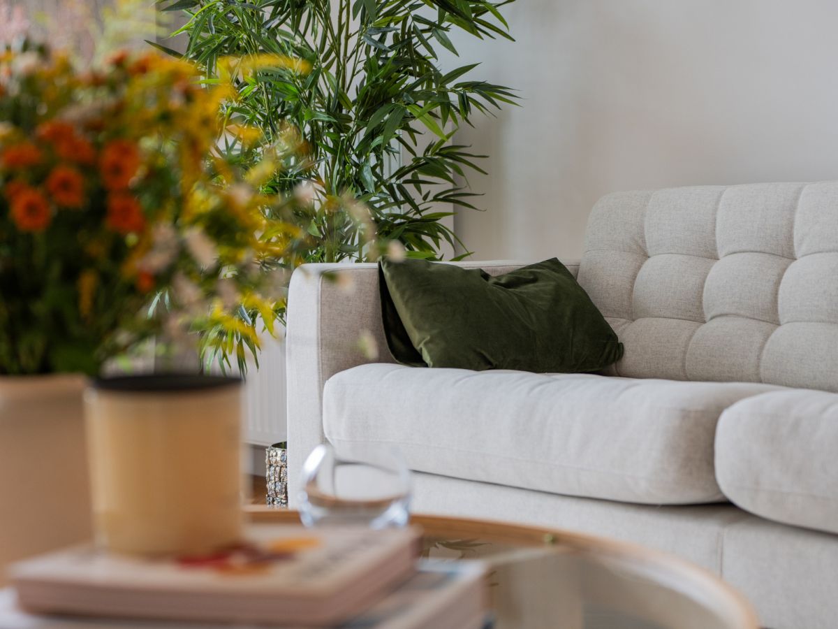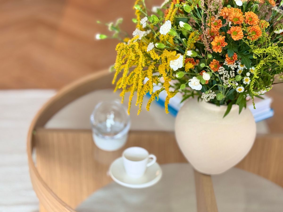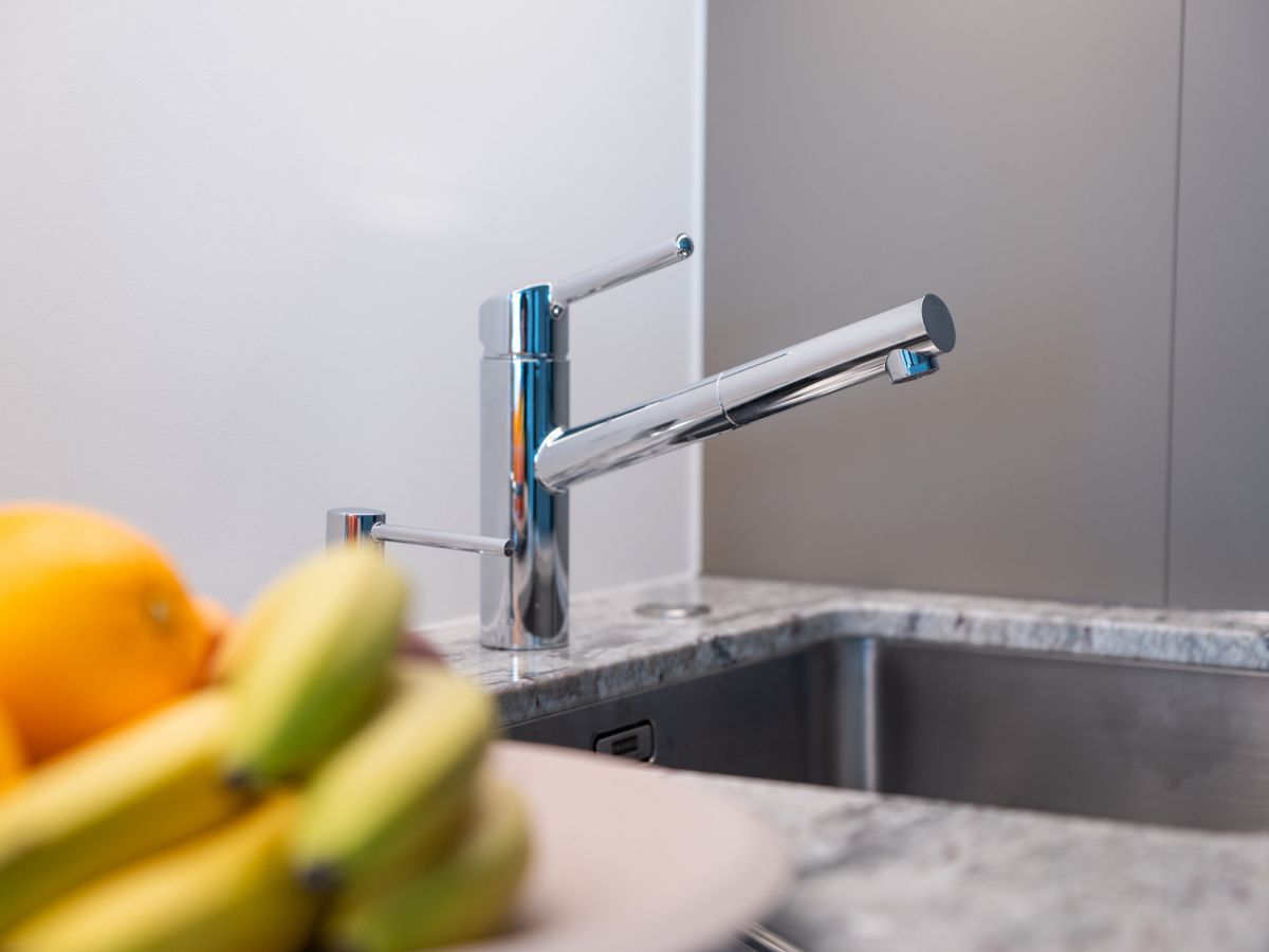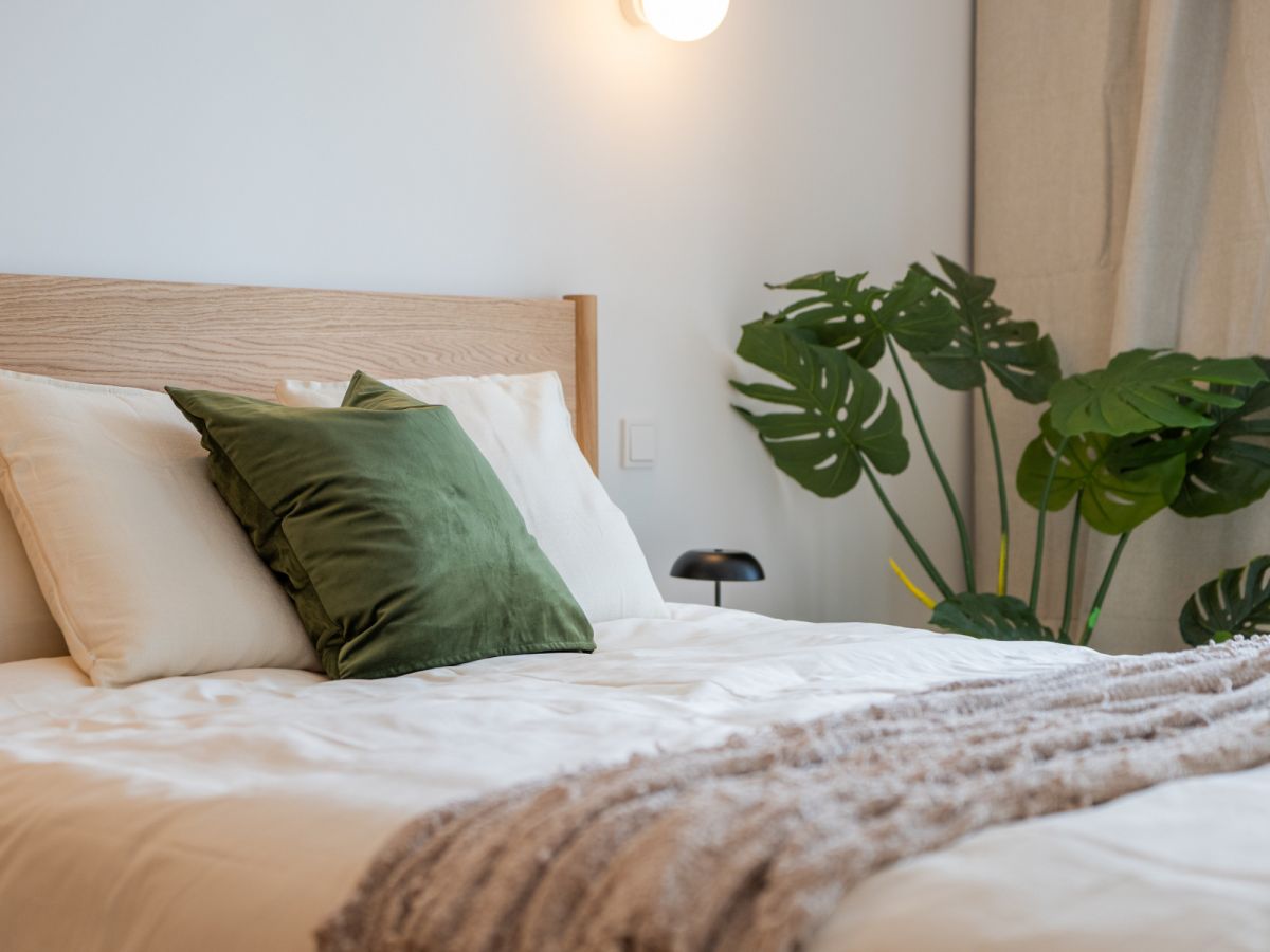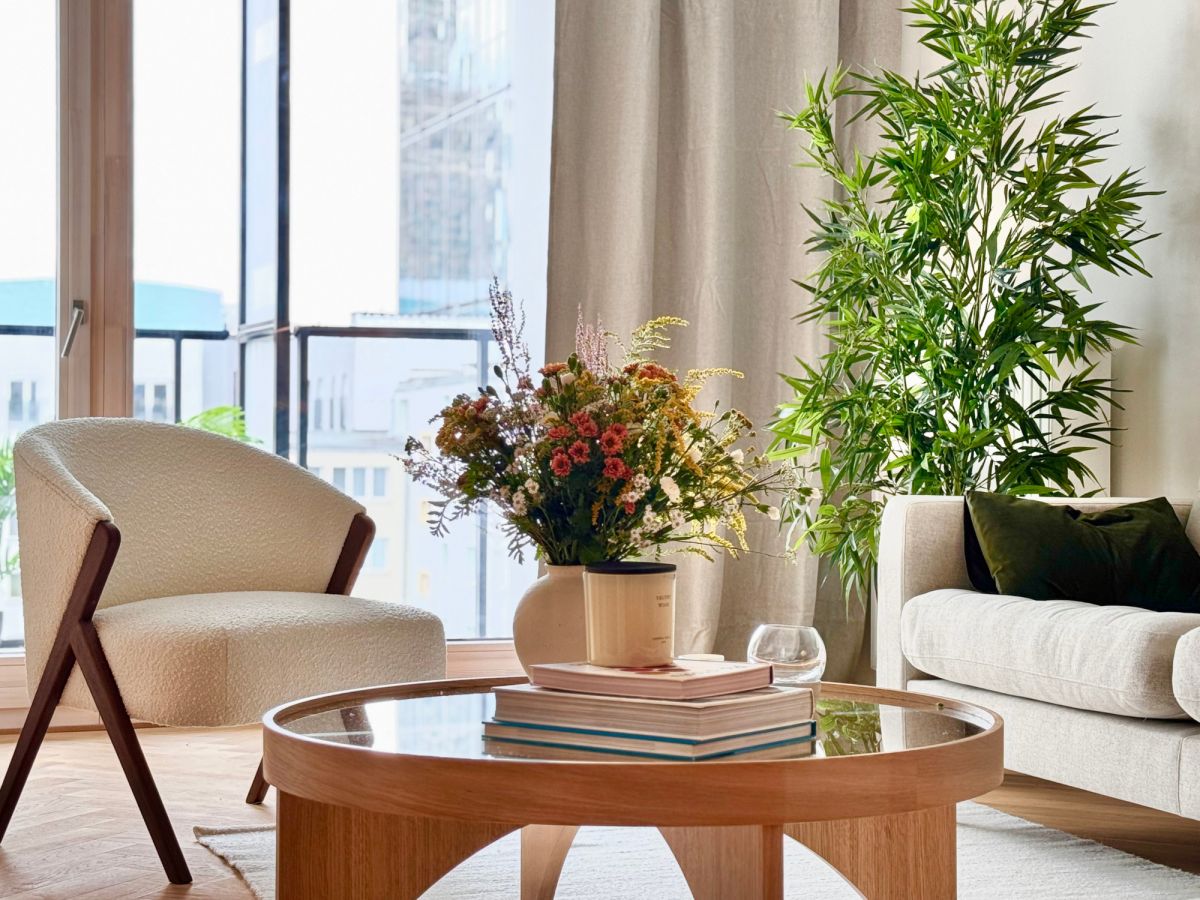W mieszkaniu zastosowano wysokiej klasy materiały: naturalną podłogę z woskowanego dębu, klimatyzację Mitsubishi w dwóch pomieszczeniach, zabudowę stolarską na wymiar oraz kompletną, nowoczesną kuchnię wykończoną sprzętem Franke (płyta indukcyjna z wyciągiem, piekarnik, lodówka, zmywarka, ekspres). Całość dopełniają designerskie lampy, harmonijna kolorystyka i armatura Villeroy & Boch / Grohe, tworząc atmosferę komfortu i elegancji.