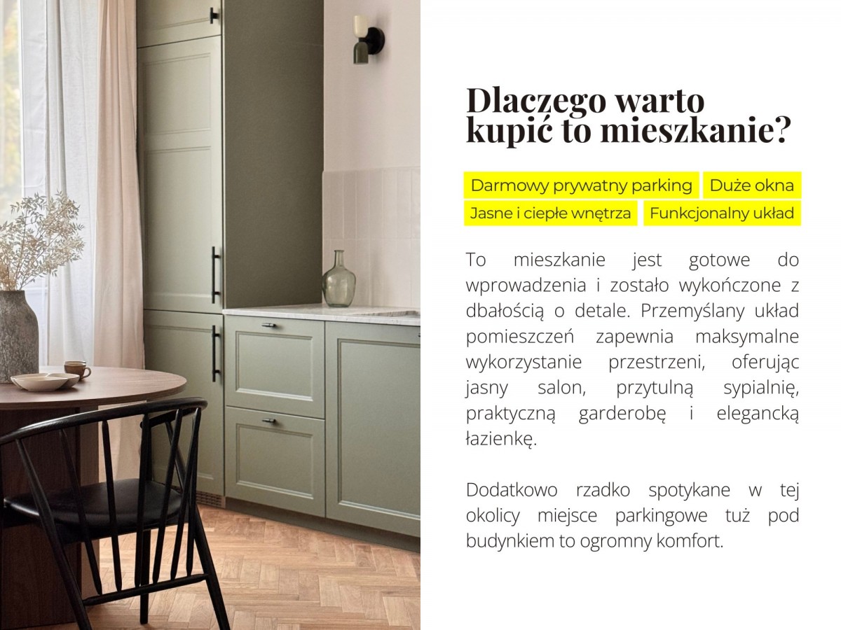 To mieszkanie łączy styl, funkcjonalność i komfort codziennego życia. Gotowe do wprowadzenia, wykończone z dbałością o detale i zaprojektowane tak, aby od pierwszego kroku można było poczuć się „u siebie”.