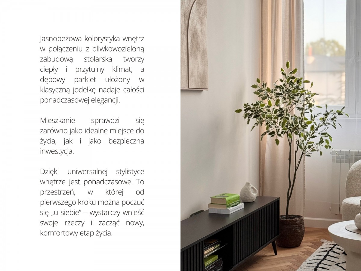 • stylowe wnętrze: beżowa kolorystyka, oliwkowozielona stolarka na wymiar, dębowy parkiet w klasyczną jodełkę,