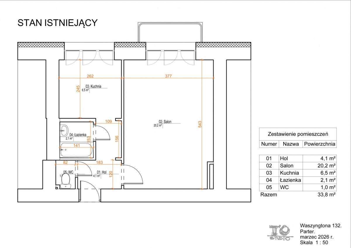 Obecny układ 1-pokojowy daje możliwość stworzenia salonu z aneksem kuchennym i wyjściem na balkon, oddzielnej sypialni, funkcjonalnej łazienki z miejscem na pralkę i zabudowę.