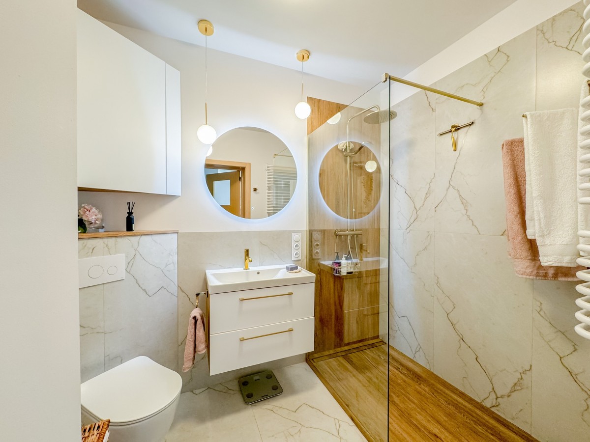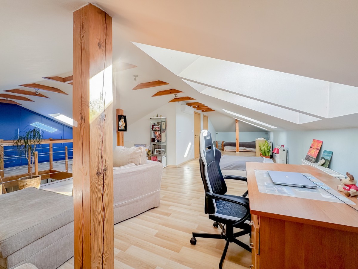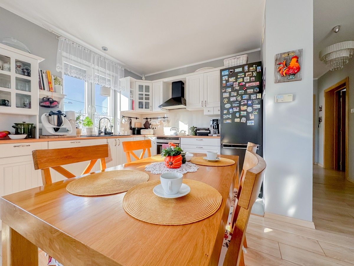 Na poddaszu znajdziemy pomieszczenie gospodarcze, drugą łazienkę oraz ogromna otwarta przestrzeń, która świetnie sprawdzi się jako strefa dzienna. W mieszkaniu w zależności od potrzeby funkcjonalności na podłodze znajdują się dobrej jakość panele lub gres, schody natomiast wykonane się z litego drewna, którego motyw jest odczuwalny w całym mieszkaniu (np. odkryte jętki i słupy konstrukcyjne na poddaszu). Na wiosnę tego roku łazienka znajdująca się na pierwszym piętrze przeszła generalny remont, włącznie z dołożeniem elektrycznego ogrzewania podłogowego, ciężko znaleźć kogoś kto nie lubi ciepłej podłogi, po wyjściu z pod prysznica:)