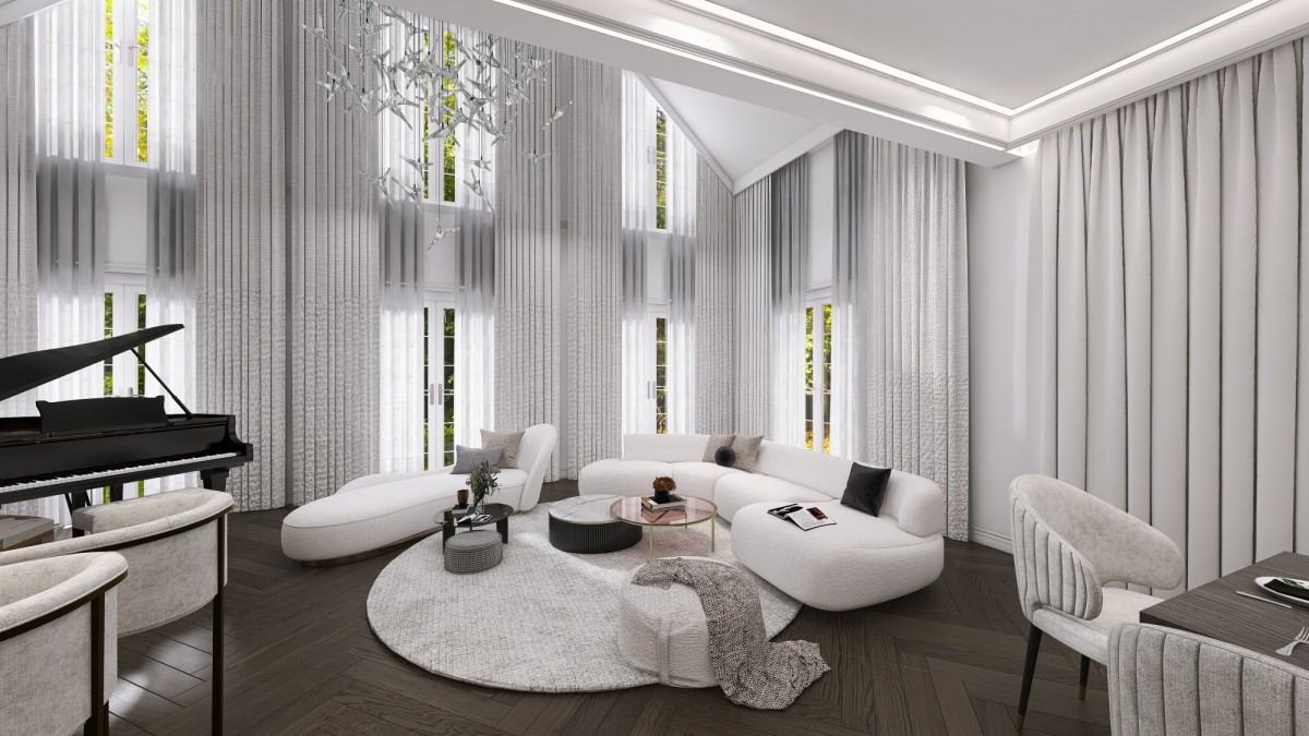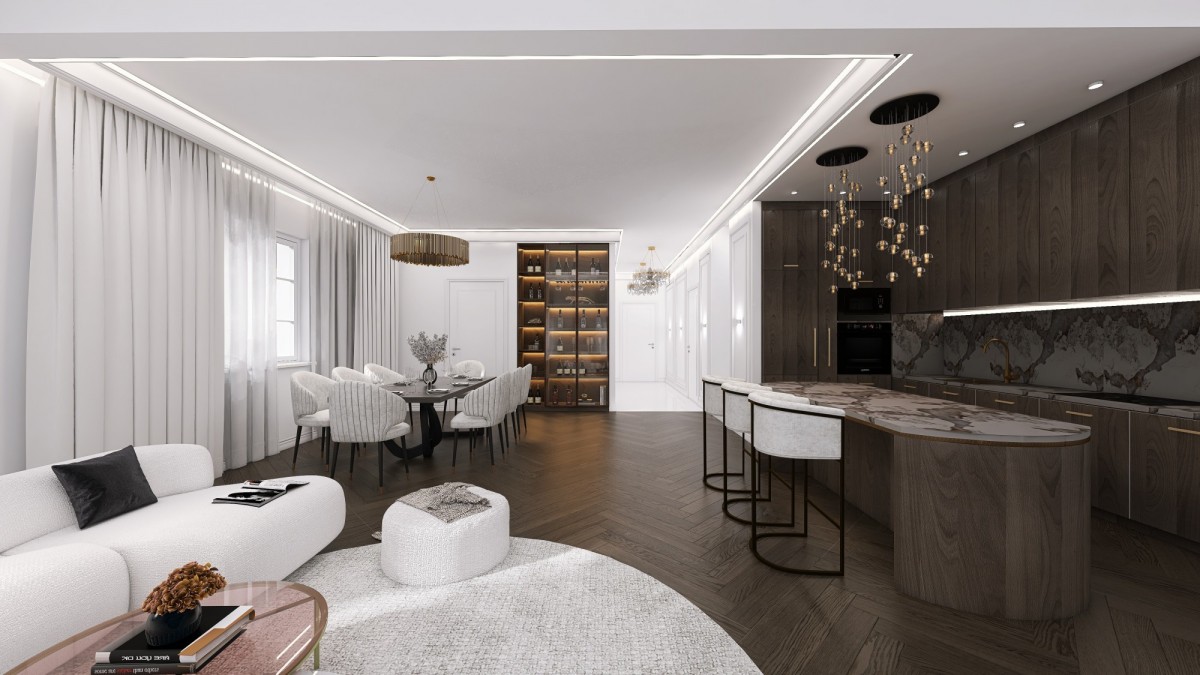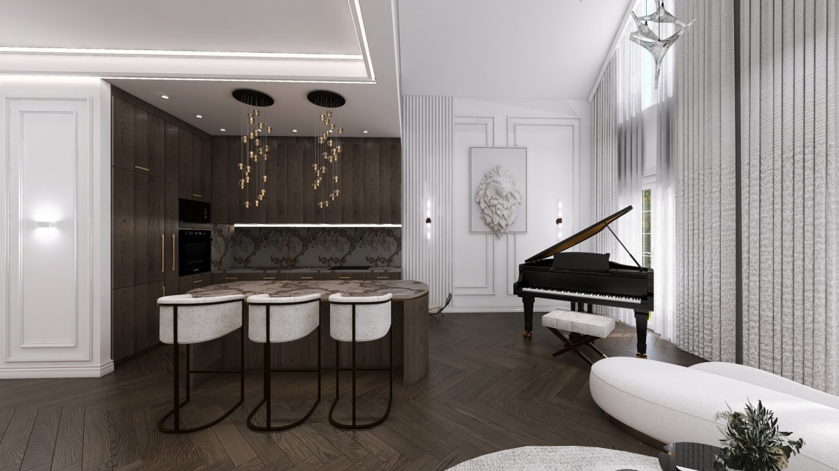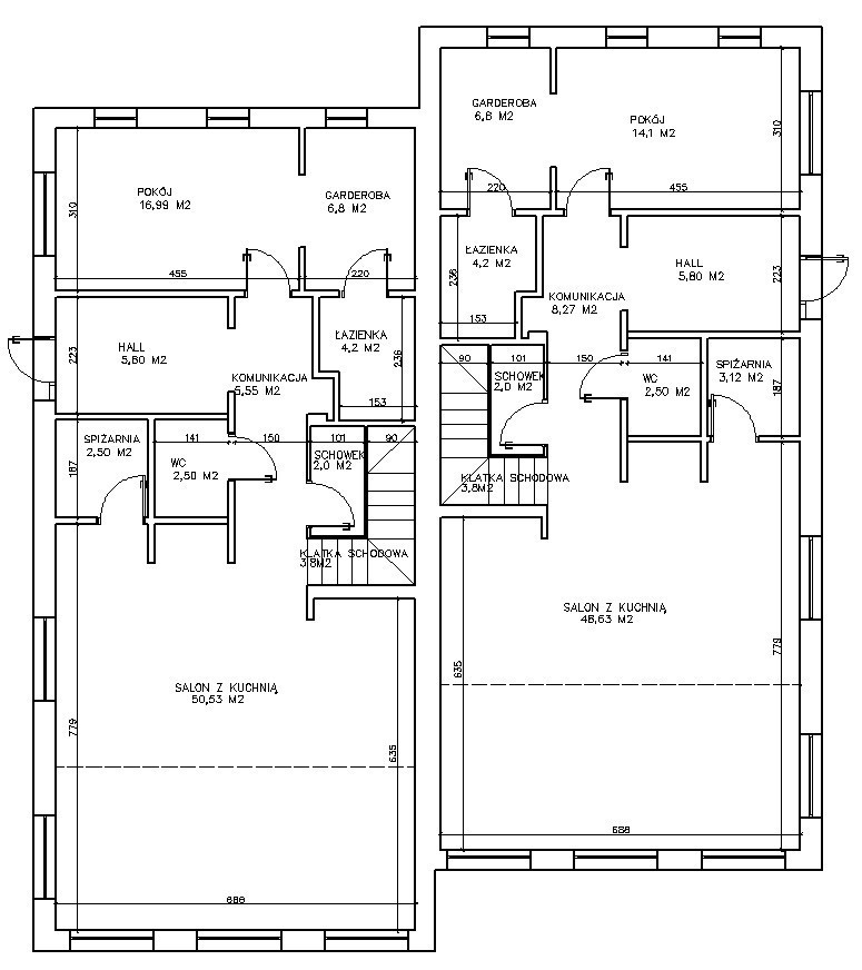 - Salon z kuchnią 50,53 mkw. (wysokość salonu około 6,5 metra)