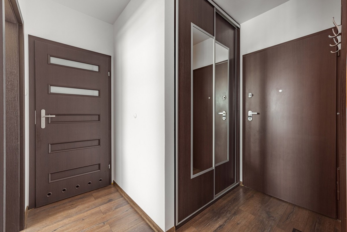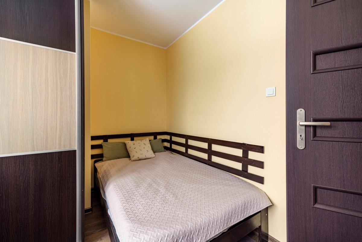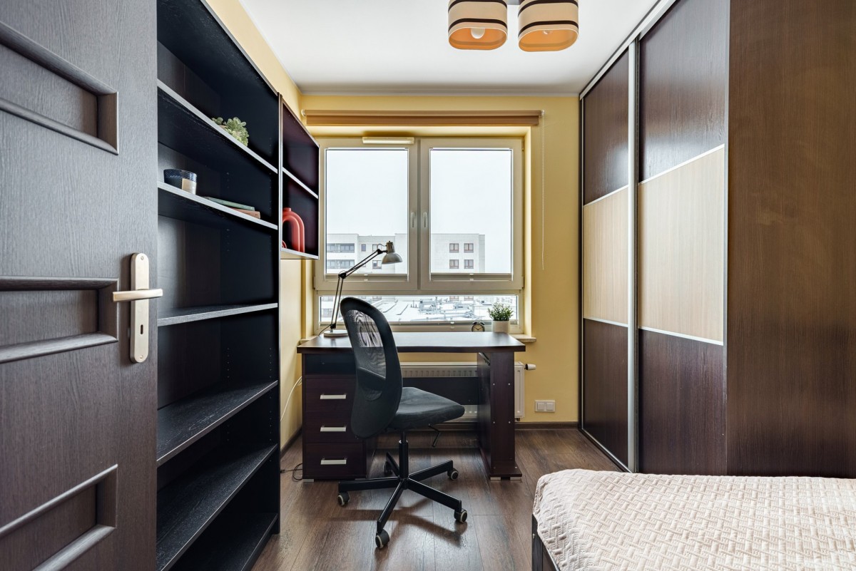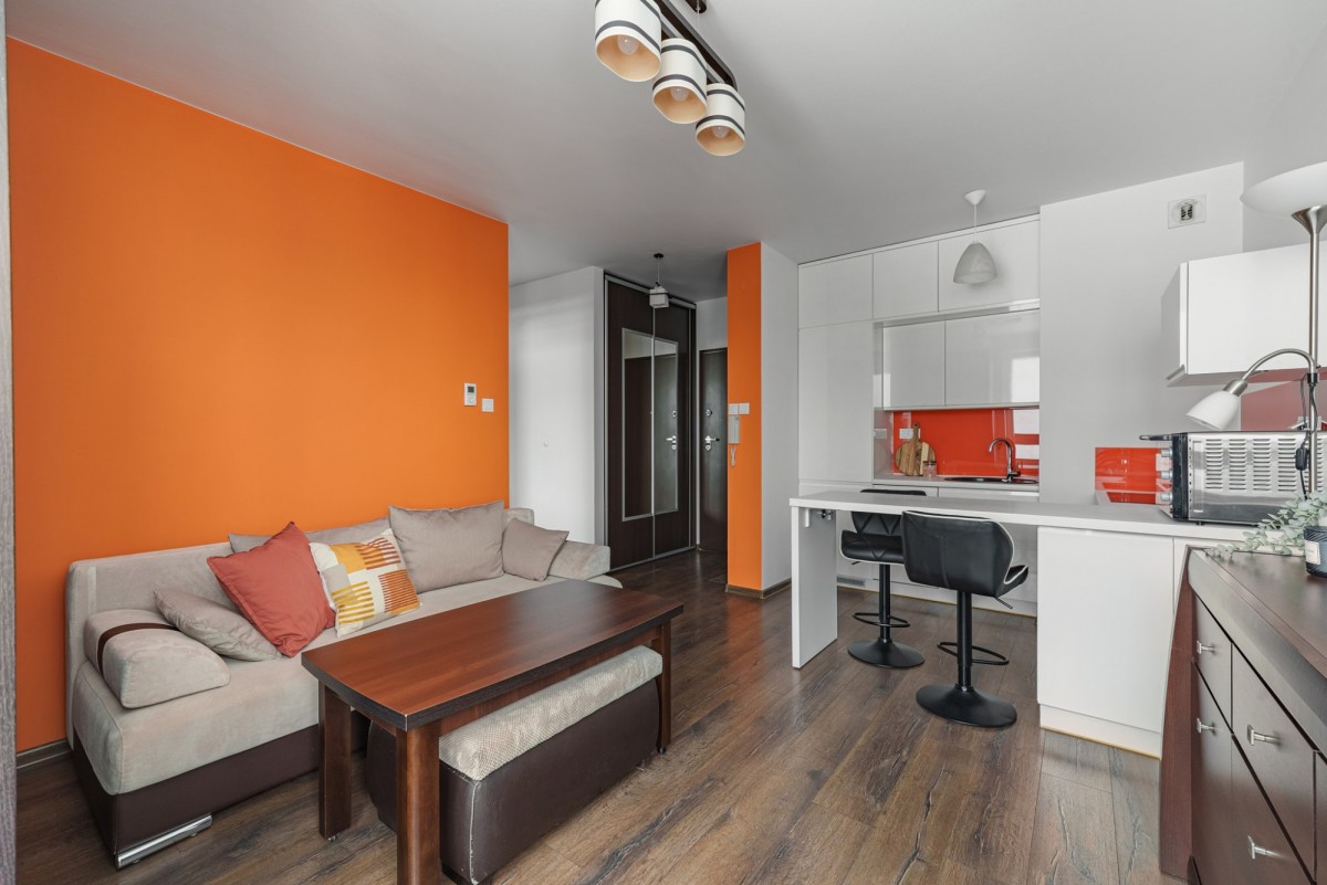 Mieszkanie jest w pełni umeblowane i wyposażone w sprzęt AGD, w tym płytę indukcyjną, piekarnik, lodówkę, zmywarkę, mikrofalówkę oraz pralkę. Salon oferuje wygodną rozkładaną kanapę, stolik kawowy, telewizor oraz stół z hokerami, natomiast w sypialni znajduje się łóżko, komfortowa przestrzeń do pracy, pojemna szafa oraz regał. Do mieszkania przynależy miejsce postojowe w garażu podziemnym. Osiedle jest zamknięte, objęte ochroną oraz monitoringiem, co zapewnia mieszkańcom poczucie bezpieczeństwa i spokoju.