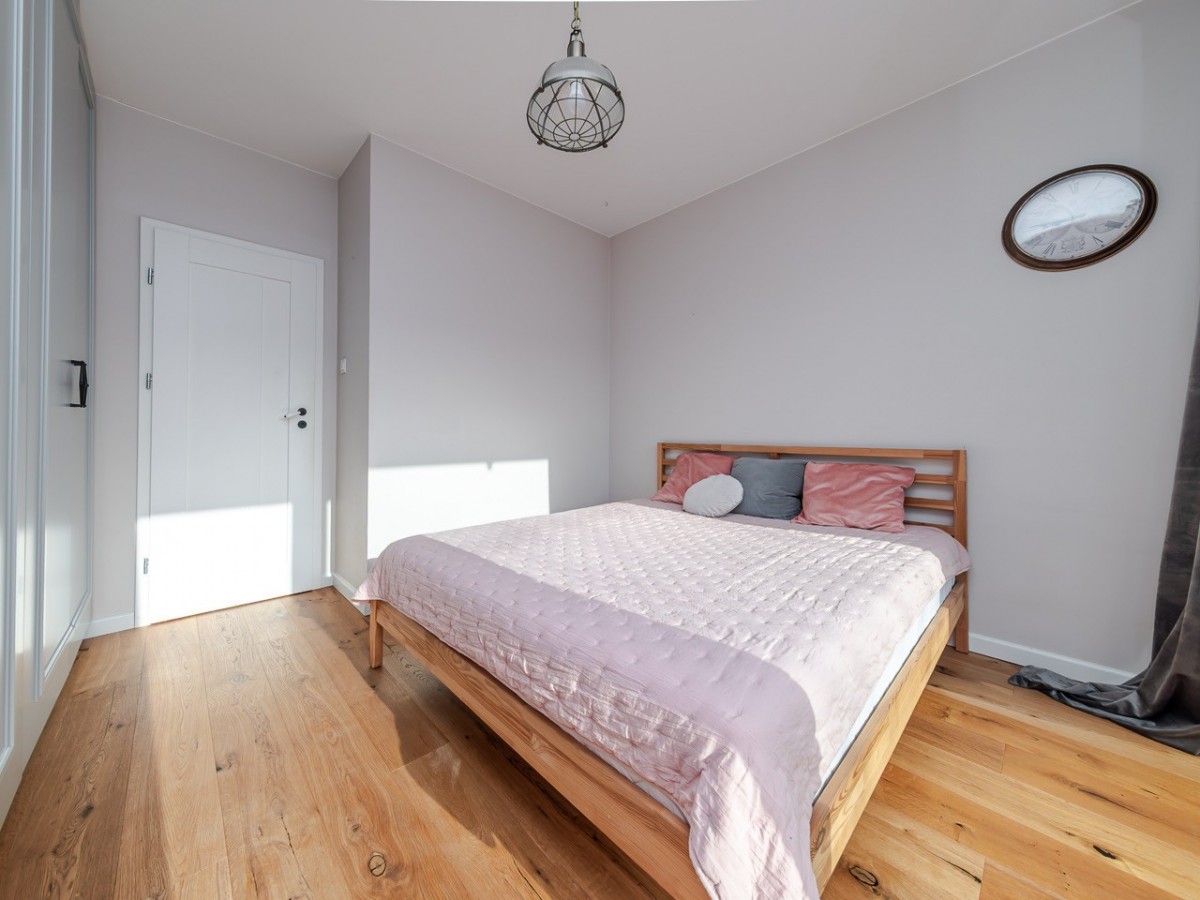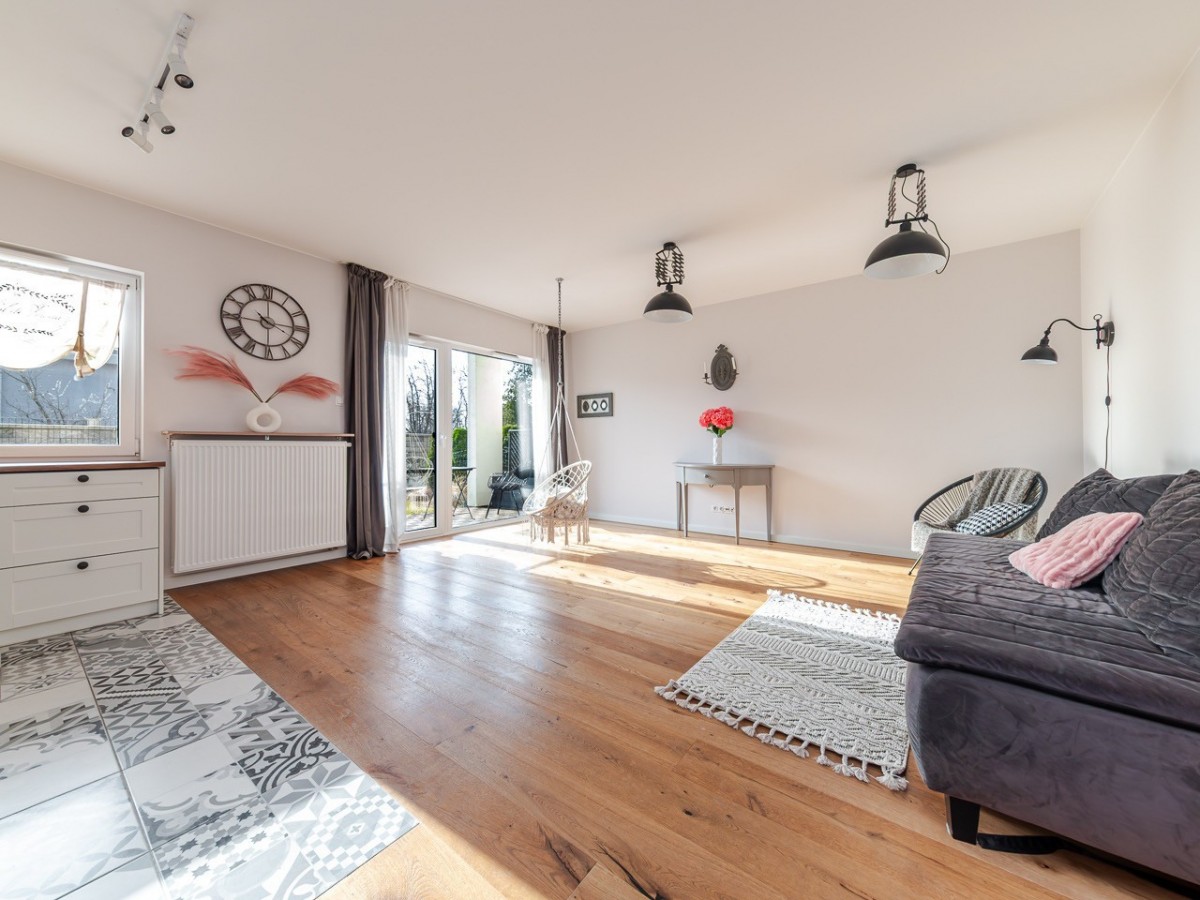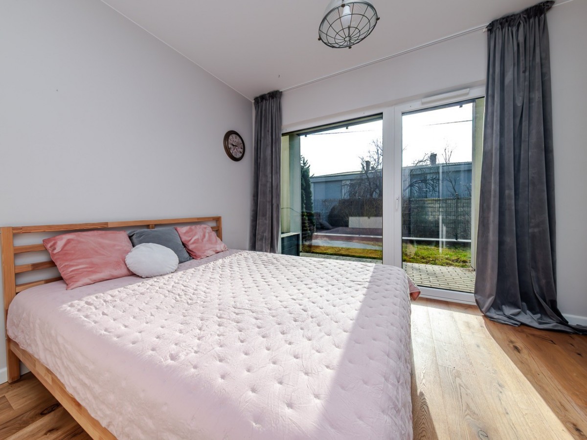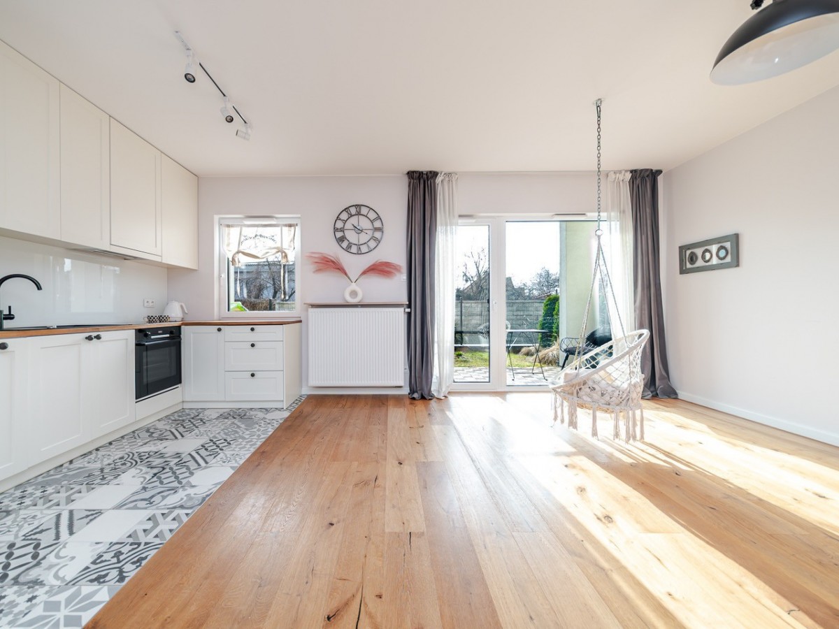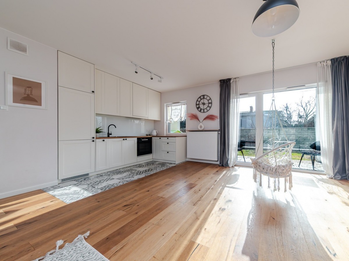 Mieszkanie jest bardzo dobrze doświetlone dzięki południowo-zachodniej ekspozycji okien, a duże przeszklenia prowadzą bezpośrednio na taras i ogród, tworząc przyjemną przestrzeń do wypoczynku.