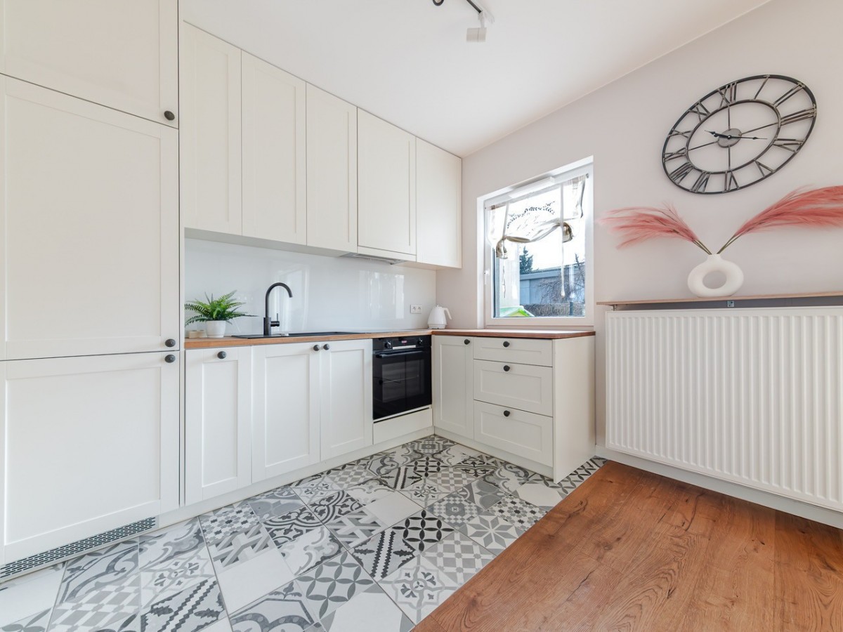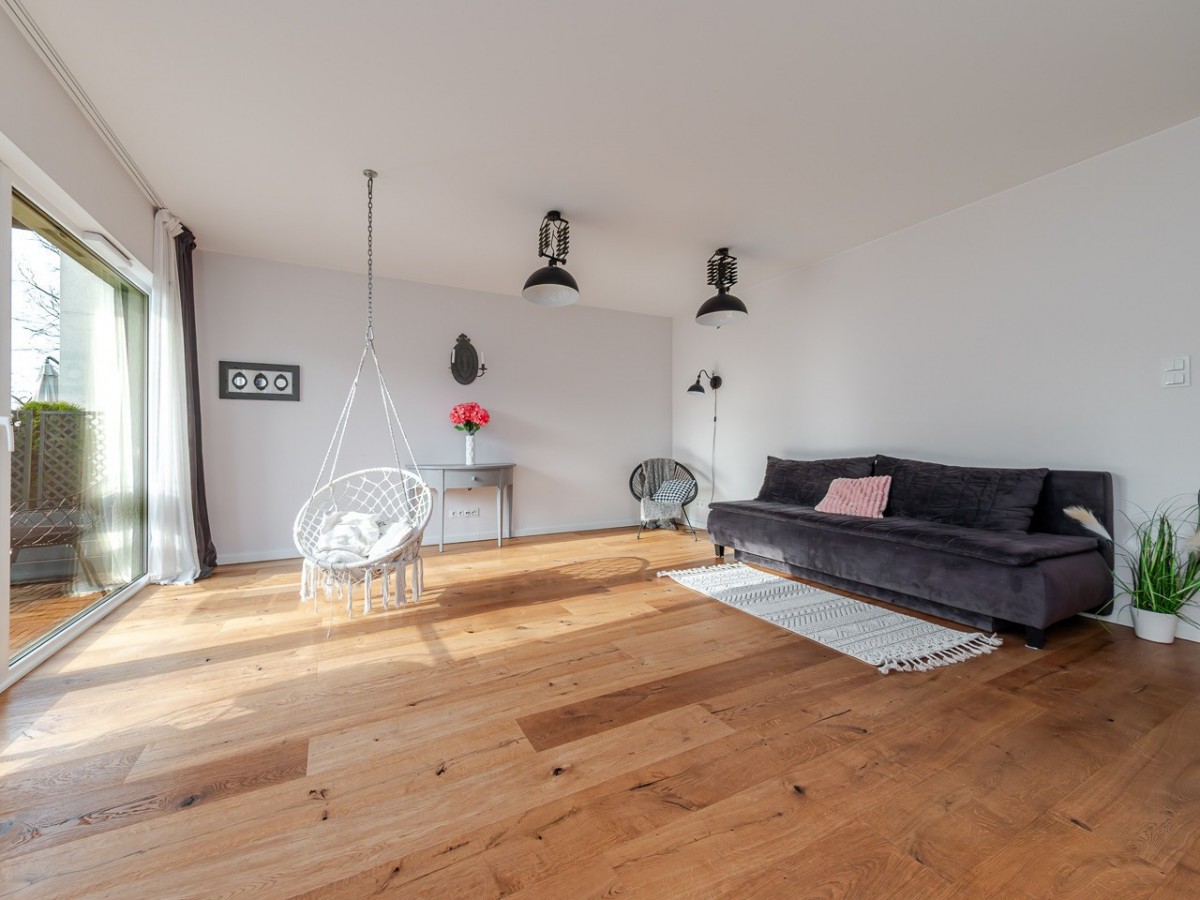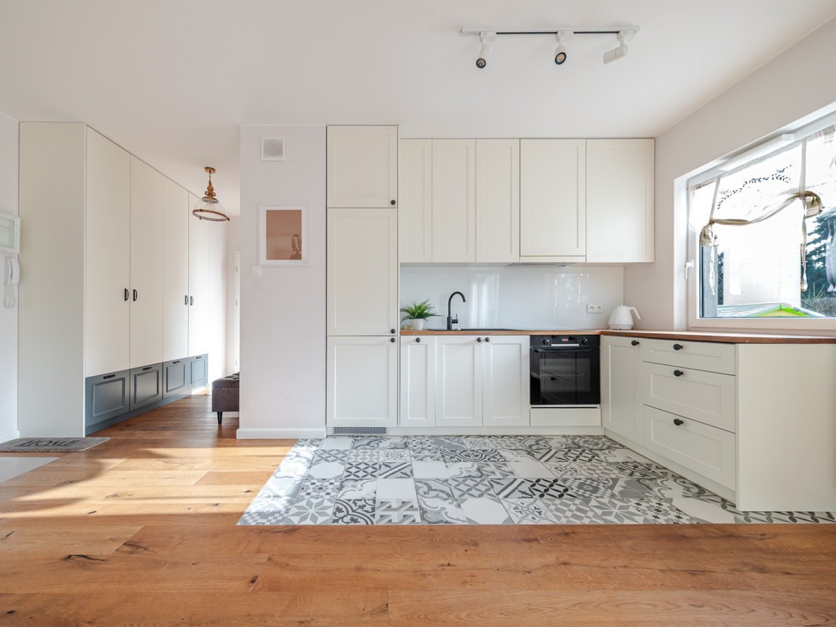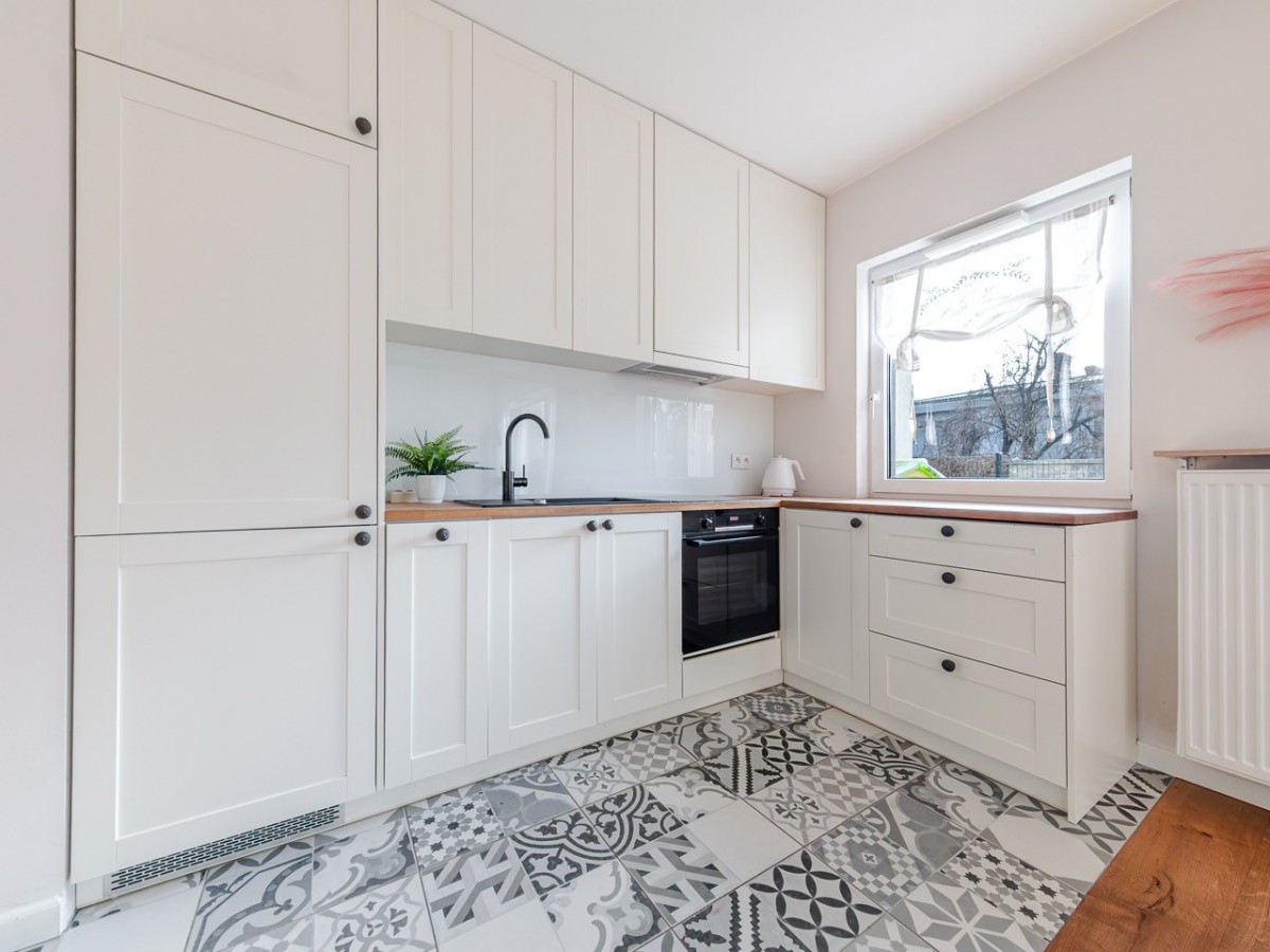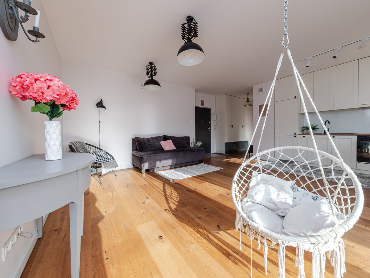 Mieszkanie jest bardzo dobrze doświetlone dzięki południowo-zachodniej ekspozycji okien, a duże przeszklenia prowadzą bezpośrednio na taras i ogród, tworząc przyjemną przestrzeń do wypoczynku.