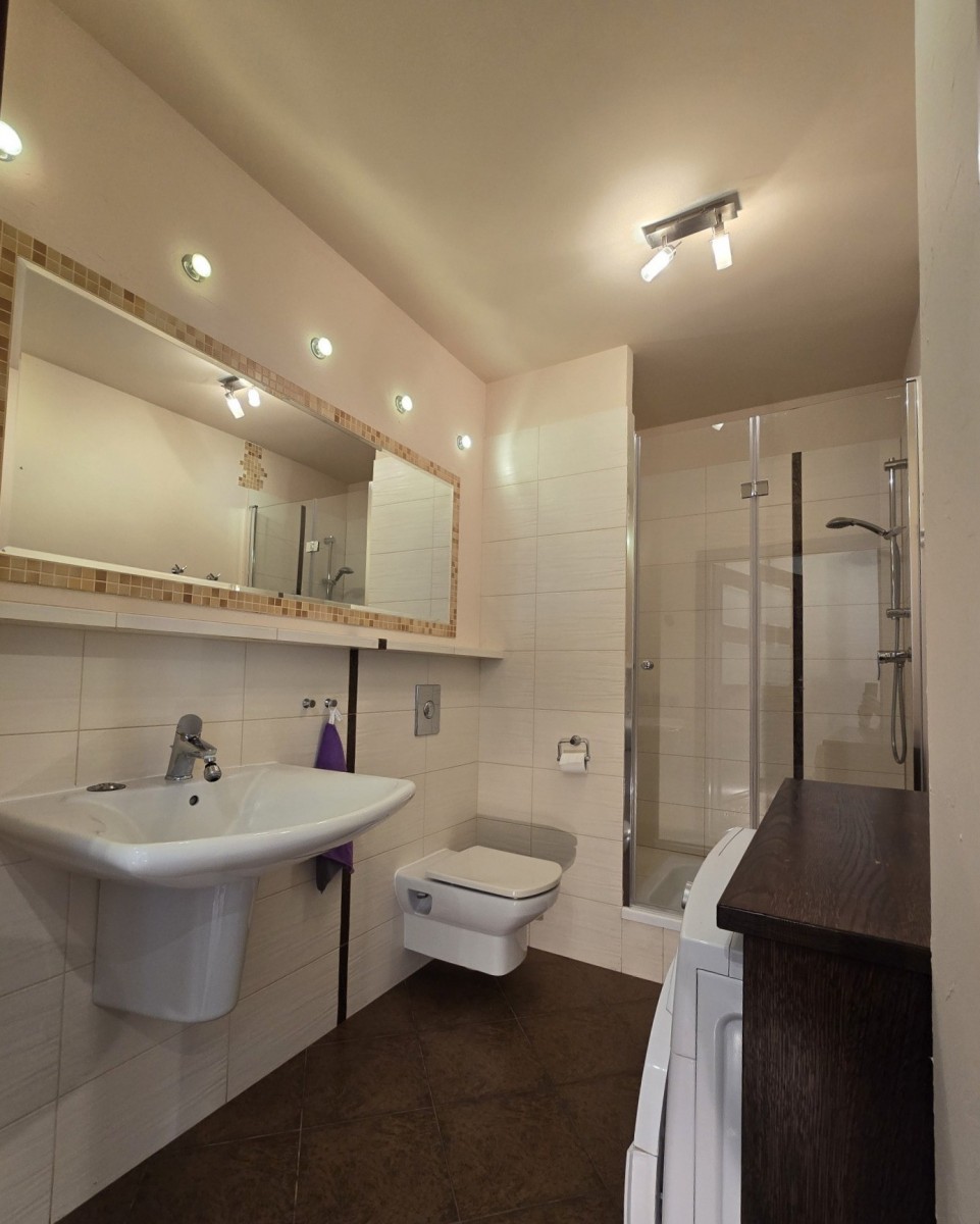 – łazienka 4,6m2 z ogrzewaniem podłogowym, wyposażona w kabinę prysznicową, umywalkę, pralkę, WC.