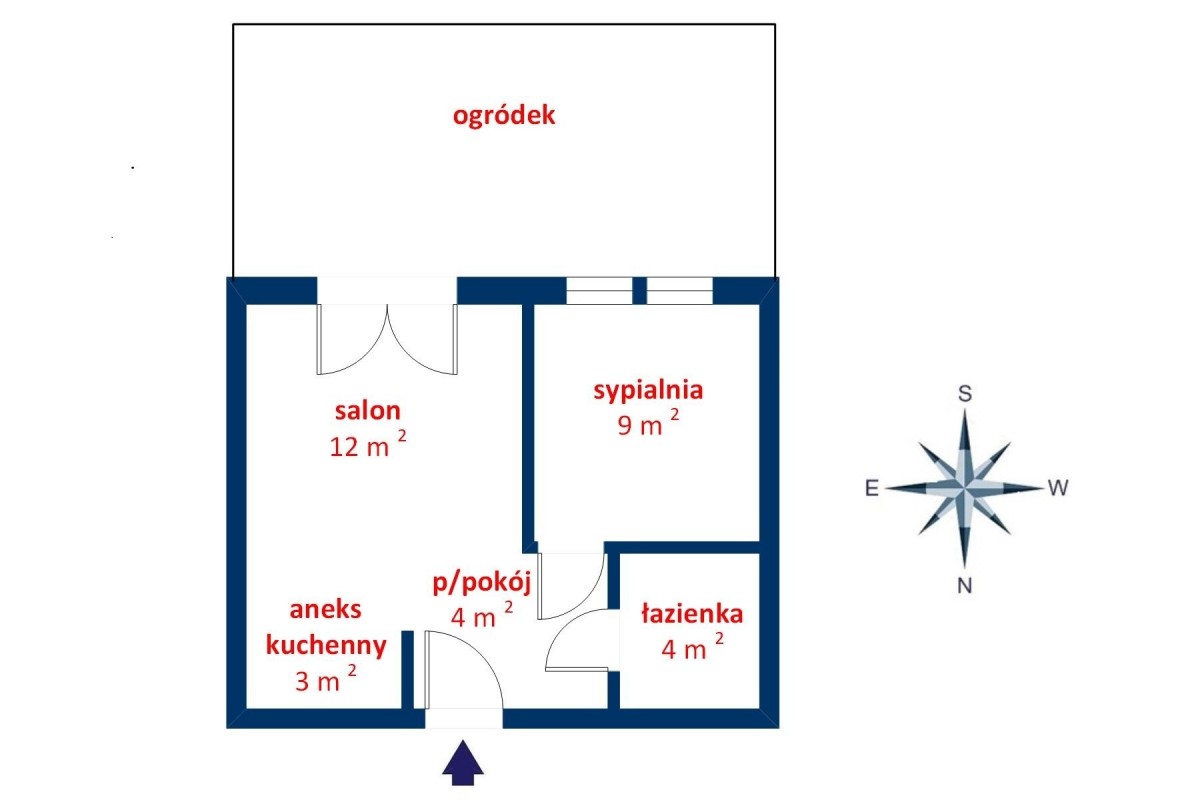 Lokal składa się z salonu z aneksem kuchennym z wyjściem do małego ogródka, sypialni, łazienki i przedpokoju.