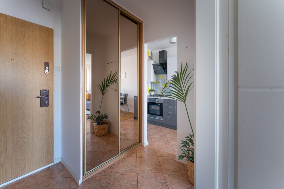 Mieszkanie na łącznej powierzchni 37,3 m2 urzeka praktycznym rozkładem, jest zadbane (na podłogach płytki, w pokojach parkiet) i w zasadzie gotowe do wprowadzenia. Za sprawą południowo-zachodniej ekspozycji salon z aneksem kuchennym (zabudowa z podstawowym AGD) oraz sypialnia są świetnie doświetlone, przez co wydają się przestronniejsze, niż wskazywałby na to metraż, co jeszcze bardziej potęguje rozciągający się z okien widok na miasto. Lokum obejmuje także łazienkę z kabiną prysznicową oraz funkcjonalny przedpokój z szafą w zabudowie. Dużym plusem jest również klasyczny balkon oraz piwnica (1,85 m2). Pomimo położenia w dosyć ruchliwej lokalizacji, mieszkanie pozostaje stosunkowo ciche.