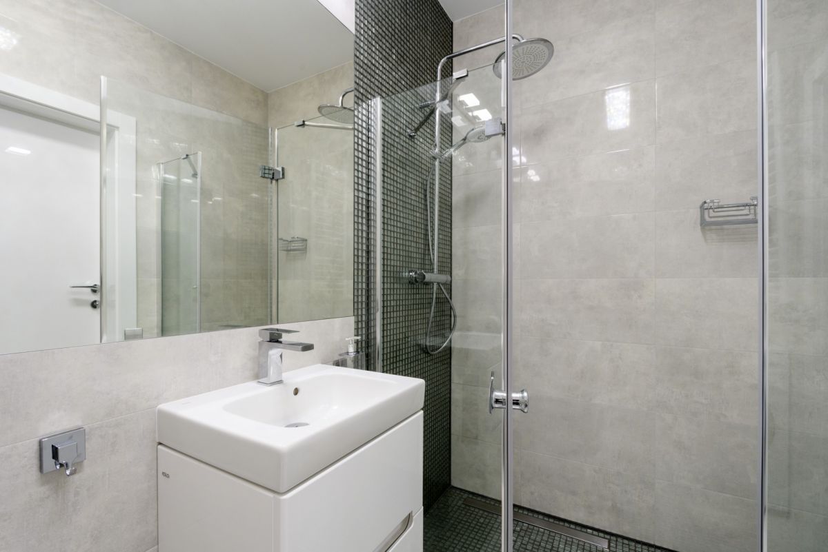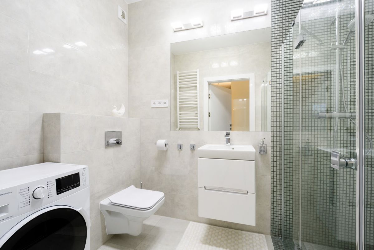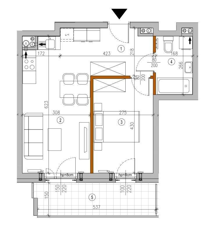 Przede wszystkim funkcjonalnie urządzona przestrzeń. Wejście do mieszkania do przedpokoju z praktyczną  szafą w zabudowie. Po prawej urządzona, biała kuchnia z wysokim blatem oraz krzesłami barowymi, dalej salon z rozkładaną kanapą, stolikiem oraz telewizorem, po lewej łazienka z prysznicem i deszczownicą, dalej sypialnia z szafą, łóżkiem i drugim telewizorem.