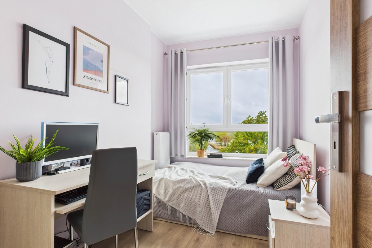 Mieszkanie jest usytuowane na ul. Dionizosa, na 3. piętrze 6-piętrowego, zadbanego budynku (z windą) z 2017 roku. Ma powierzchnię 42,36 m². Składa się z przedpokoju, salonu z aneksem kuchennym, jednego pokoju sypialnianego, łazienki i balkonu. Mieszkanie jest w pełni umeblowane i wyposażone, gotowe do wprowadzenia.