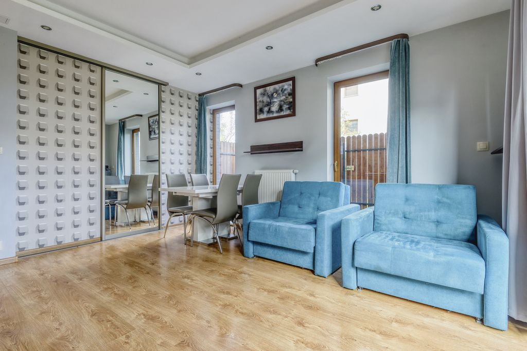 -jasny, ustawny salon z wyjściem na taras z oknami od strony północno-wschodniej.