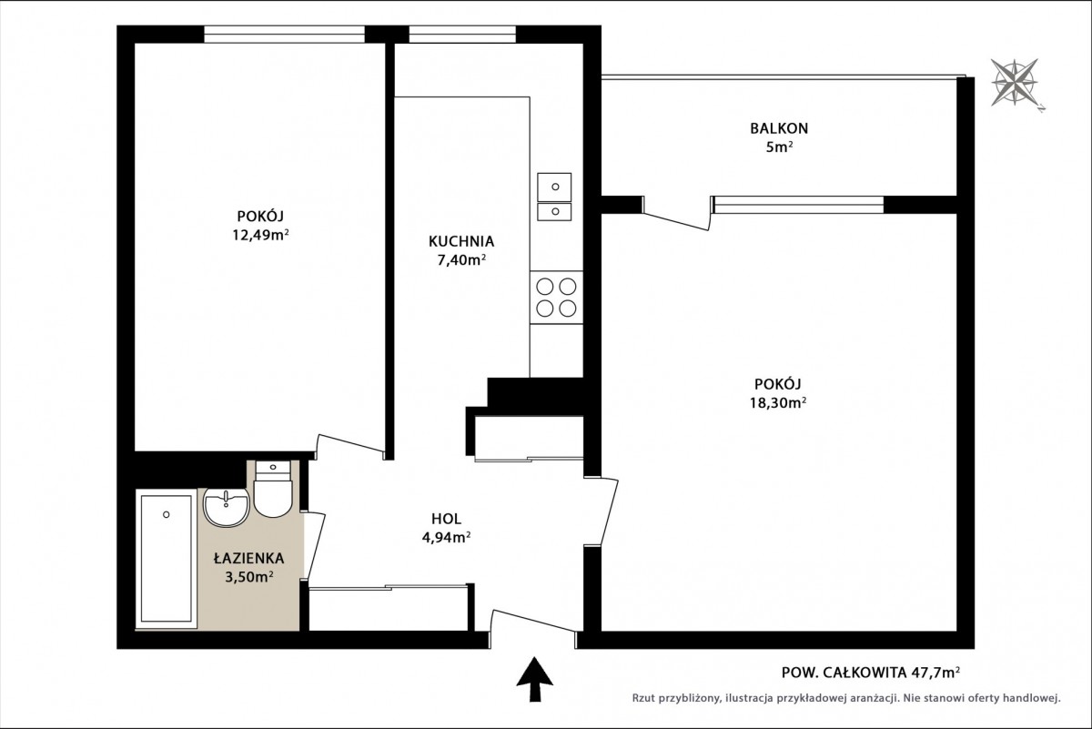 Mieszkanie o powierzchni 47,7 m² zostało zaprojektowane w sposób maksymalnie wykorzystujący dostępną przestrzeń i układ funkcjonalny. Składa się z dwóch osobnych pokoi, oddzielnej, widnej kuchni, łazienki z WC oraz przedpokoju. Taki rozkład sprawia, że nieruchomość może być idealną propozycją zarówno dla singla, pary, jak i rodziny 2+1 lub inwestora szukającego mieszkania pod wynajem.