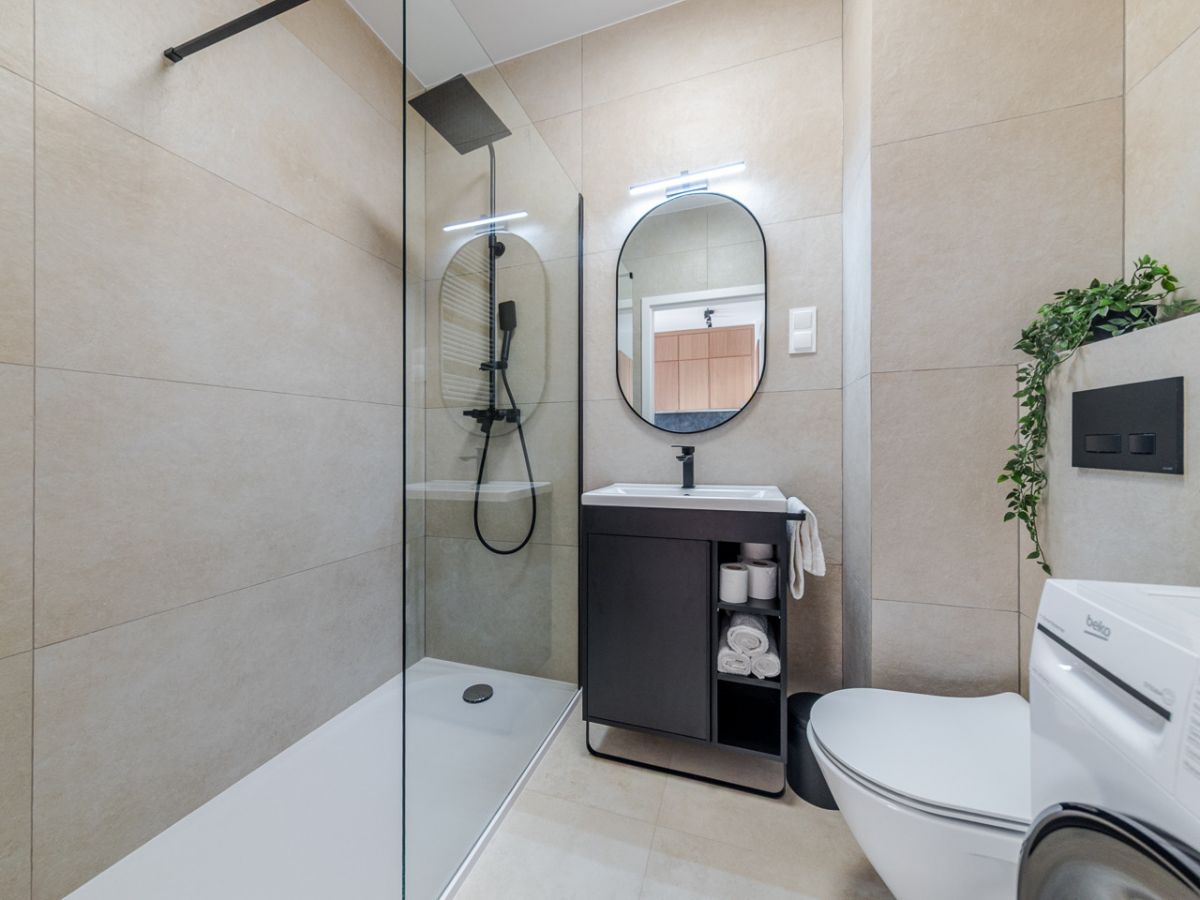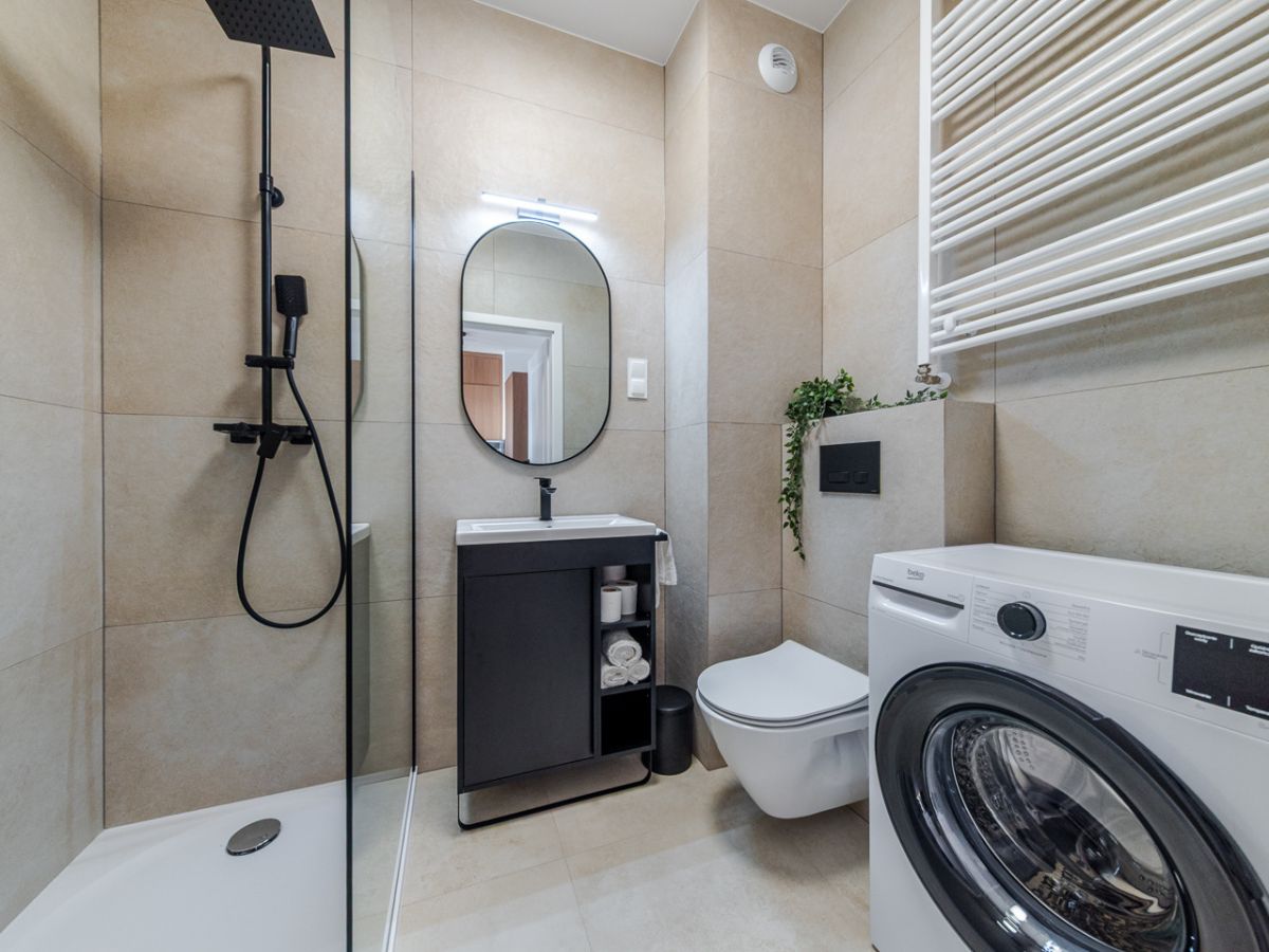 Łazienka(3,50 m²) – elegancka łazienka wykończona beżowym gresem, z nowoczesną armaturą, pralką Beko oraz dużym prysznicem typu walk-in.