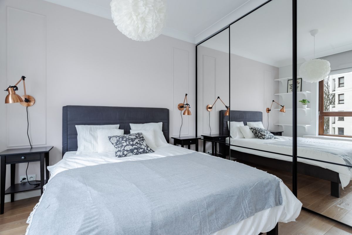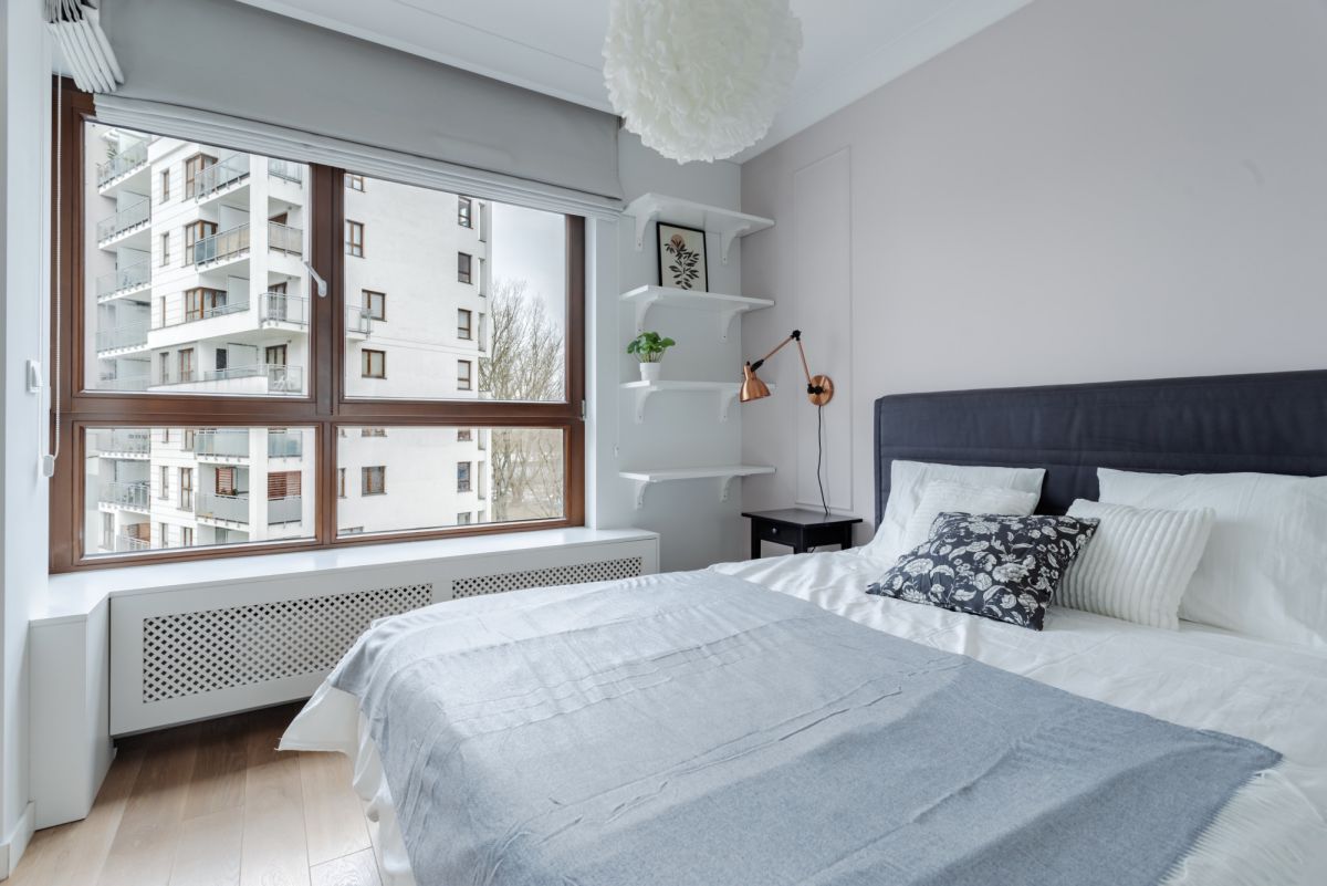 Sypialnia (12,51 m²) – ustawna, z dużym łóżkiem oraz maskownicą na grzejnik połączoną estetycznie parapetem(jest zdejmowana), a samo wejście posiada drzwi przesuwne, aby w ten sposób zaoszczędzić miejsce w sypialni. Wielkim atutem tego pomieszczenia jest szafa wykonana na wymiar na całą ścianę – samo miejsce zostało powiększone przez zamknięcie pierwotnego wejścia do sypialni od przedpokoju.