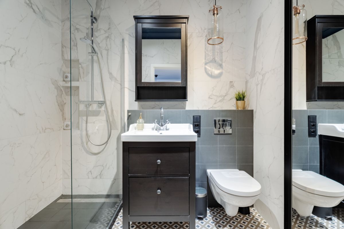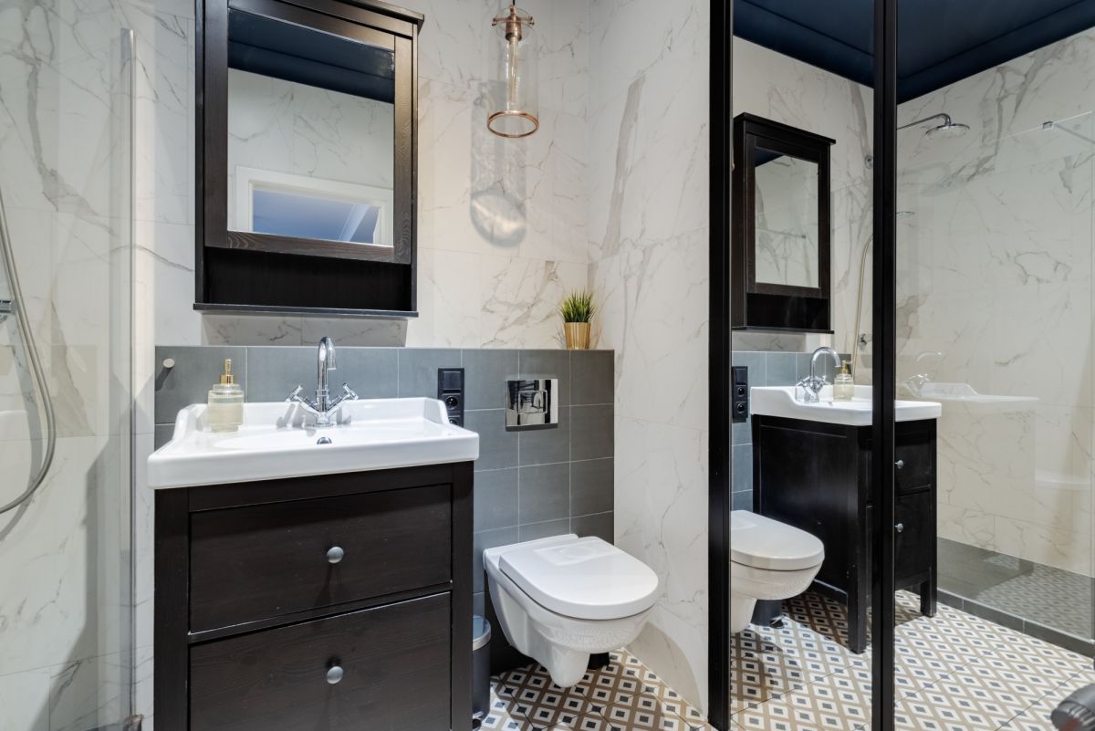 Łazienka (4,54 m²) – wystarczająco przestronna, z kabiną prysznicową typu walk-in, pralką schowaną w szafie wykonanej na wymiar oraz umywalką i WC. Posiada mnóstwo miejsca do przechowywania.