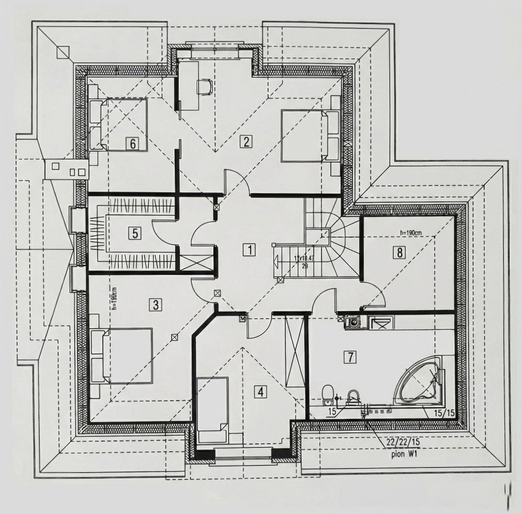 - Poddasze: ok. 60 m² powierzchni użytkowej – wysokie, bez znacznych skosów