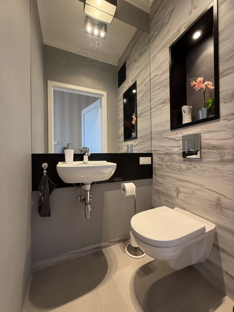 Mieszkanie zostało wykończone w wysokim standardzie – drewniane podłogi, nowoczesna ceramika, wykładziny w sypialniach. Wysokość pomieszczeń: 2,80 m, duże okna zapewniają naturalne światło przez cały dzień.