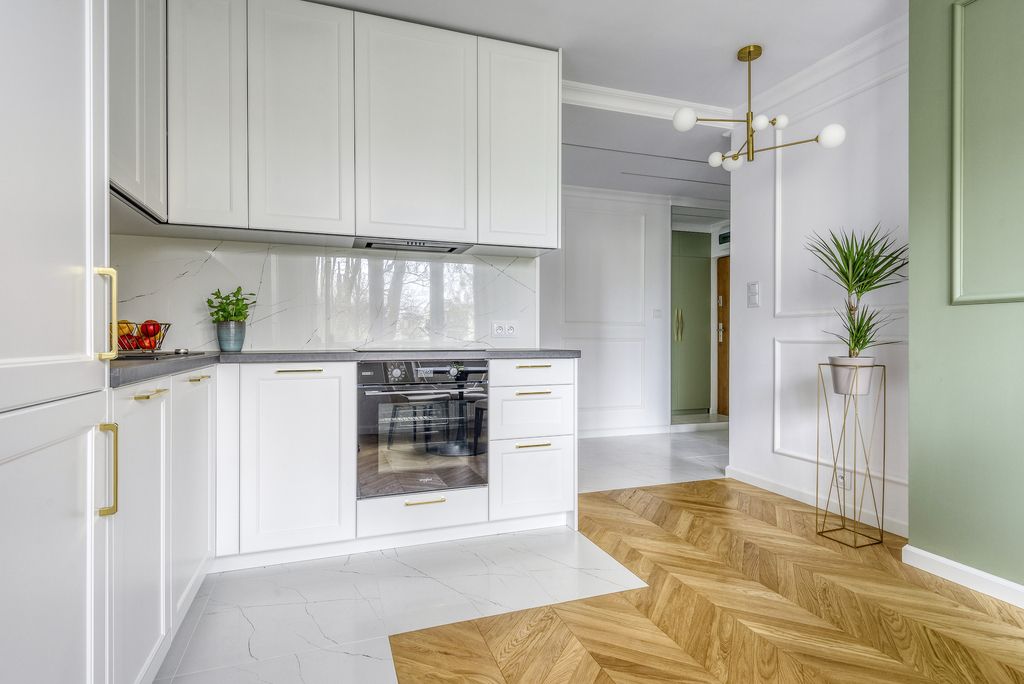 - Nowa dębowa podłoga ułożona w elegancką jodełkę francuską
