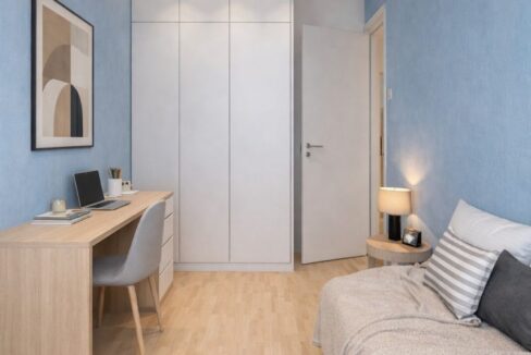The apartment consists of a living room with access to a balcony connected to a bright kitchen, a small bedroom suitable as a child’s room or home office, a large bedroom with a double bed, spacious wardrobe and second balcony, a bathroom with a shower area, and a hallway with a built-in wardrobe.