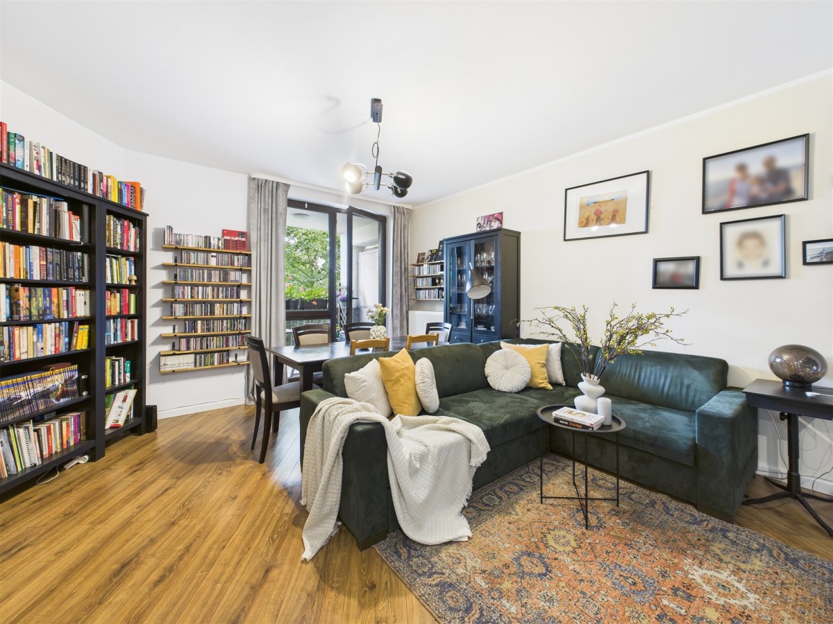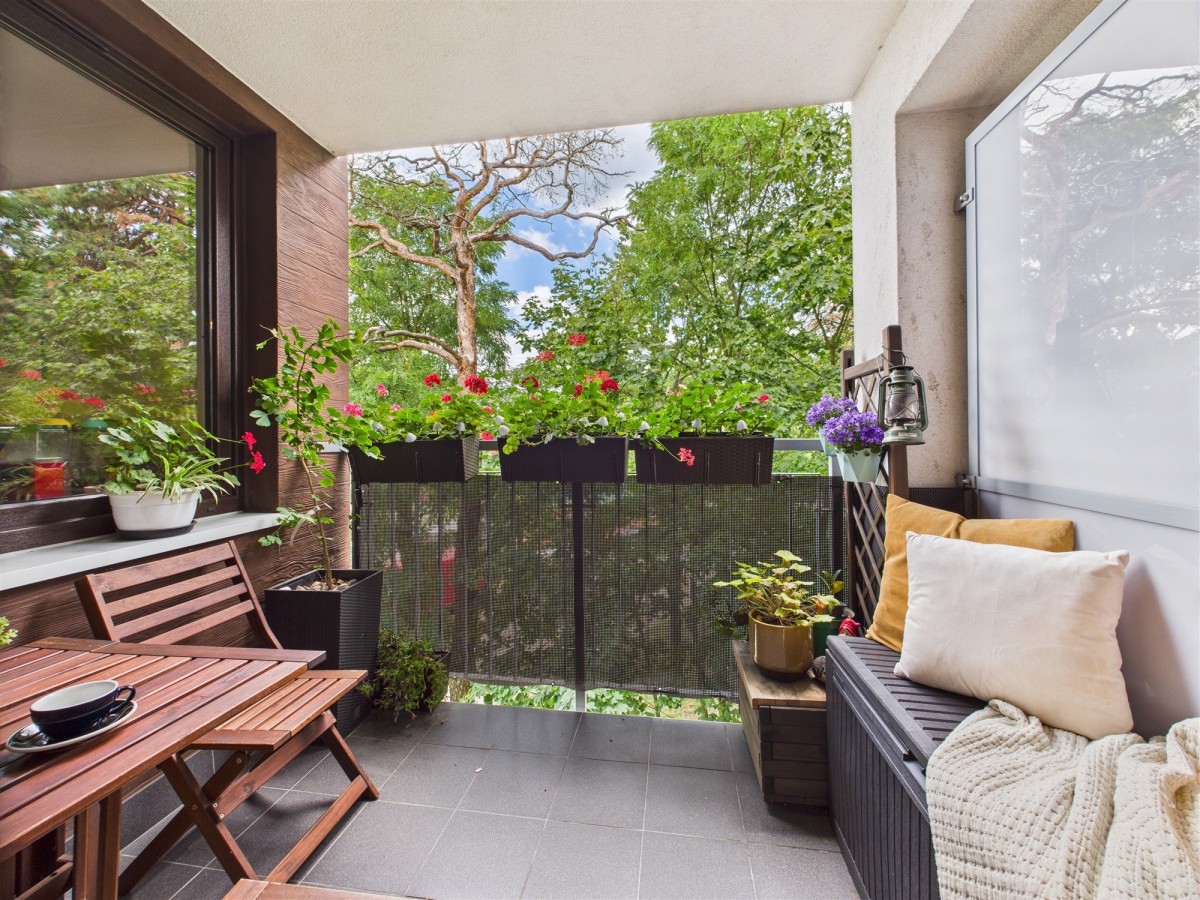 salon z wyjściem na balkon (zadaszony) z widokiem na zieleń drzew.