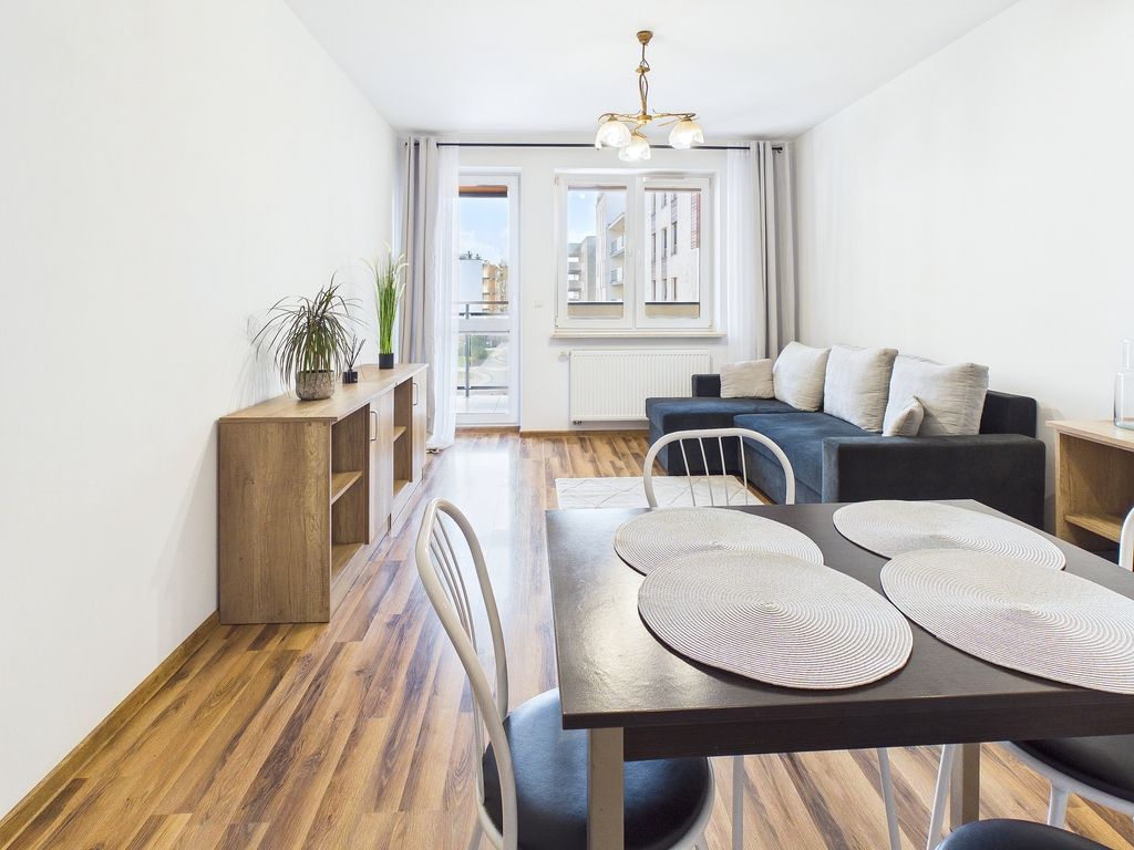A spacious, furnished, 3-room apartment with an area of 60.6 m² and a storage unit is available for rent. It is ideally located in Warsaw’s Ursus district, in the highly regarded, gated Skorosze X community at 4D A. Prystora Street. The space combines functionality with privacy and security. It is an ideal option for couples, families with children, or working individuals seeking a quiet place to live with easy access to all city amenities.