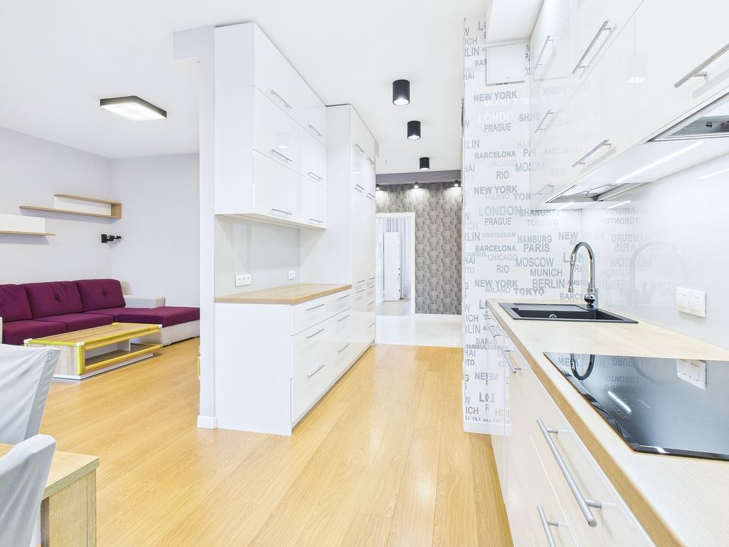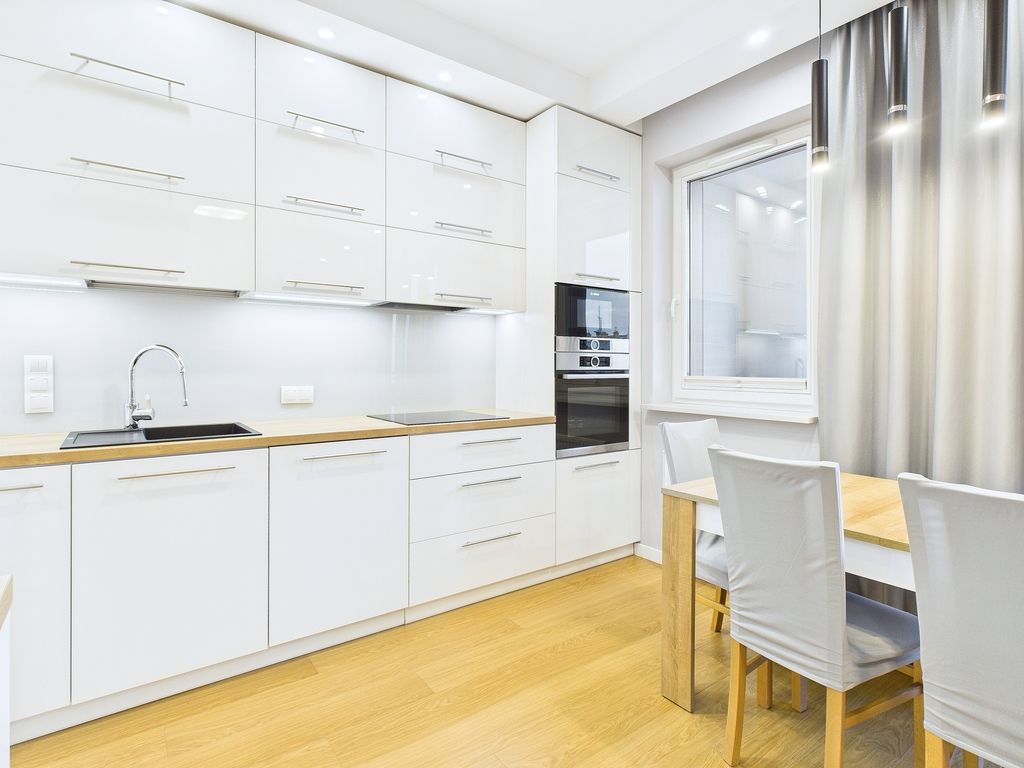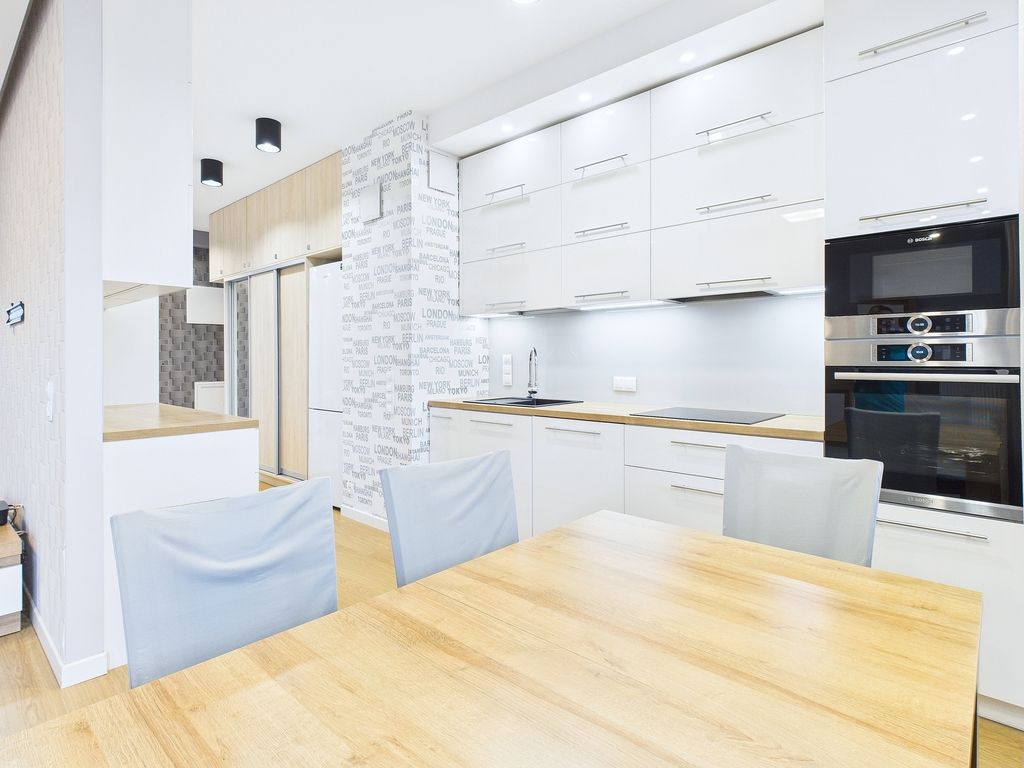 - w pełni wyposażona kuchnia z kompletem AGD: lodówka z zamrażarką, zmywarka, piekarnik, płyta grzewcza,