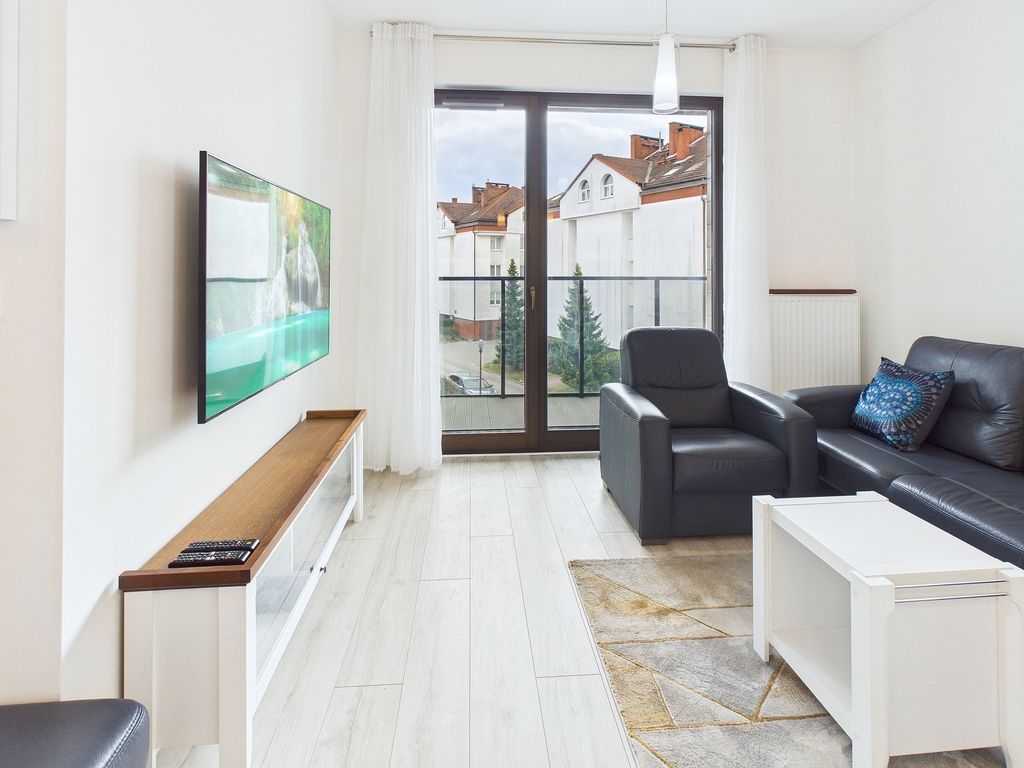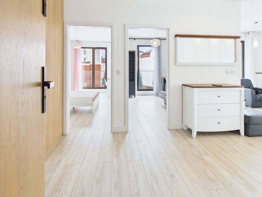 Apartament charakteryzuje się przemyślanym układem z ekspozycją wschodnio-południową, co zapewnia mnóstwo naturalnego światła. Wnętrze zostało zaprojektowane z dbałością o detale, a wysoka jakość wykończenia, białe ściany i eleganckie panele podłogowe nadają mu unikalny, skandynawski charakter. Przestronny balkon stanowi doskonałe dopełnienie części dziennej.