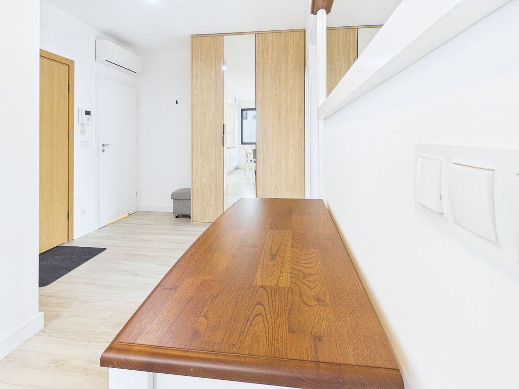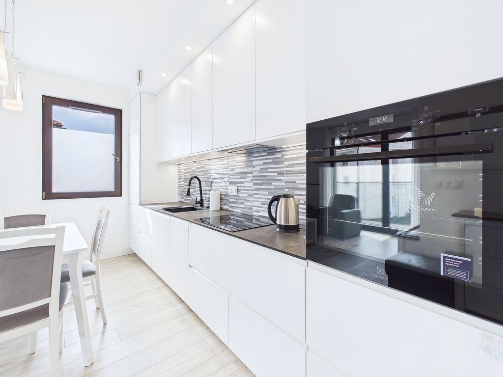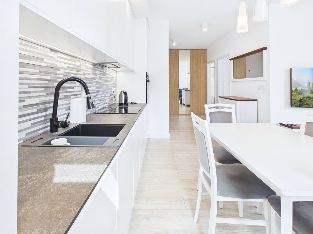 - Aneks kuchenny: z kompaktowym, nowoczesnym blatem, w pełni wyposażony w wysokiej jakości sprzęt AGD (lodówka, zmywarka).