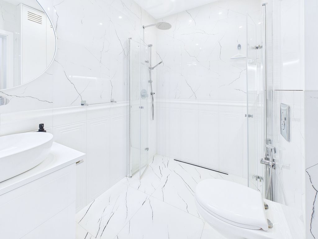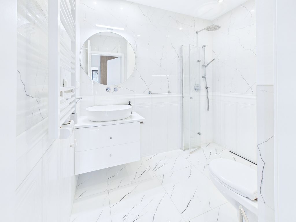 - Łazienka (4 m²): wykończona wysokiej klasy armaturą i płytkami, z dużym, nowoczesnym prysznicem oraz pralką.