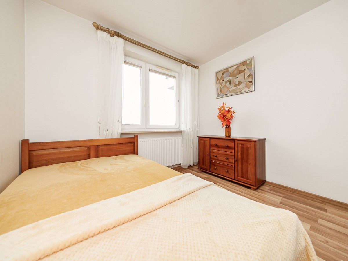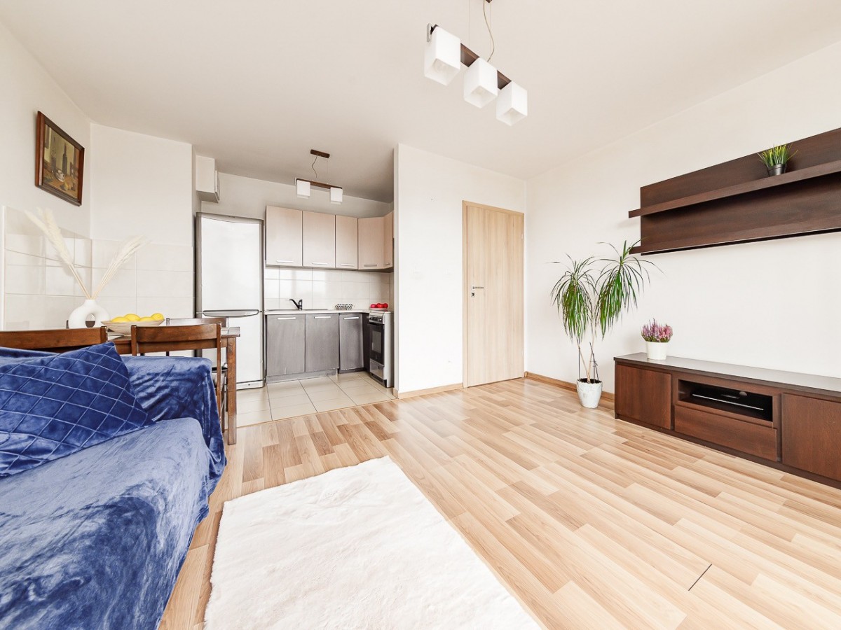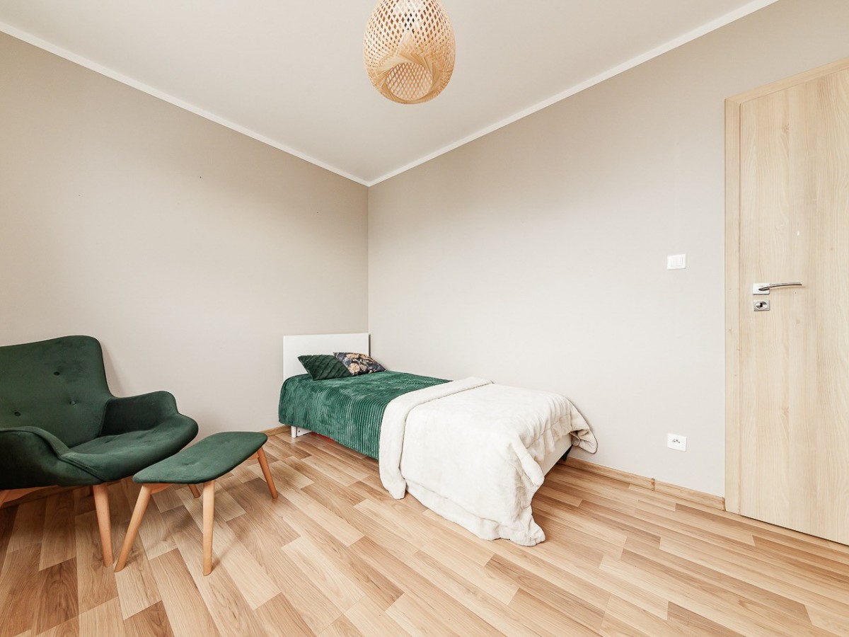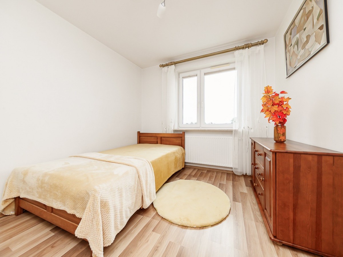 Mieszkanie jest jasne i ciepłe, dodatkowym atutem jest balkon z widokiem na zieleń zapewniający prywatność i spokój.