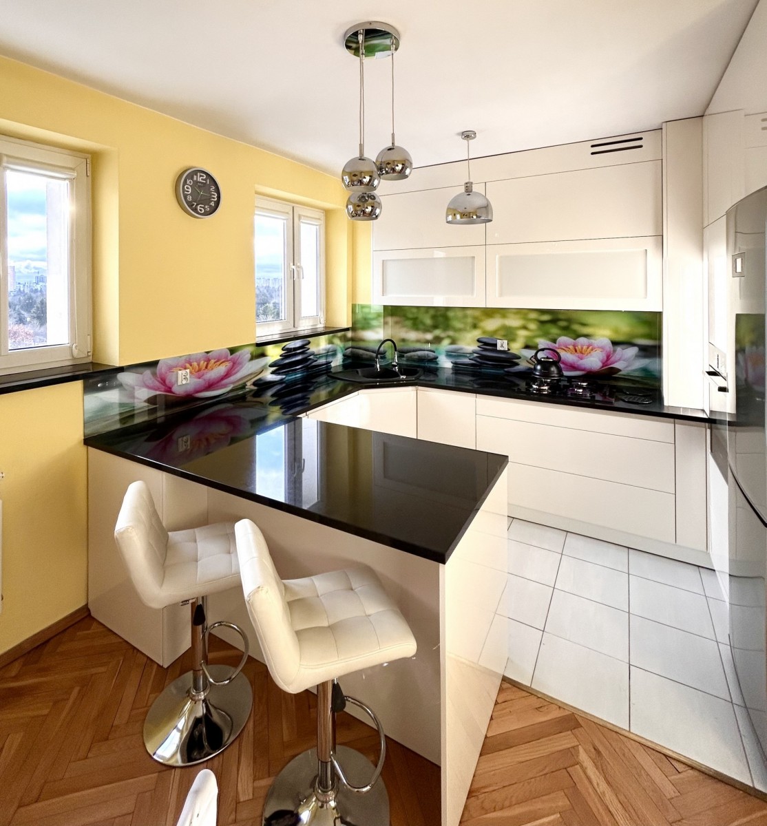 Kuchnia z jadalnią – powierzchnia ok 14,8m2 – po remoncie, z półwyspą i dwoma hokerami, meble i sprzęt AGD w cenie mieszkania.