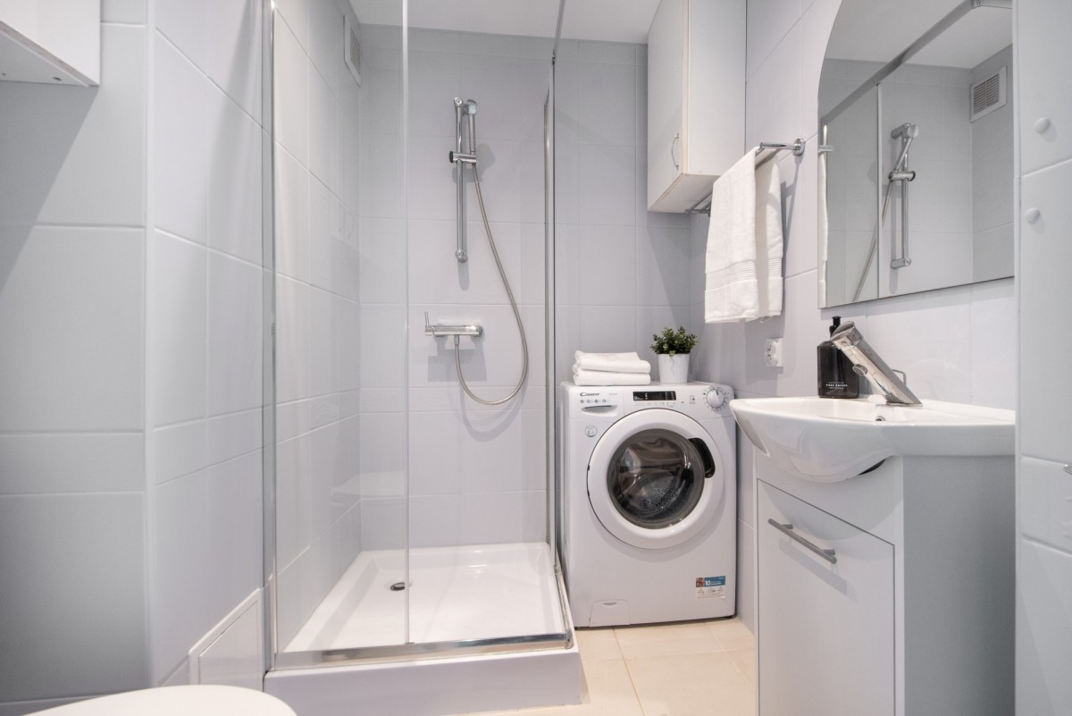- Dwóch sypialni – każda o powierzchni ok. 10 m², z czego jedna może pełnić funkcję głównej sypialni, a druga – pokoju dziecięcego, gabinetu lub pokoju gościnnego,
