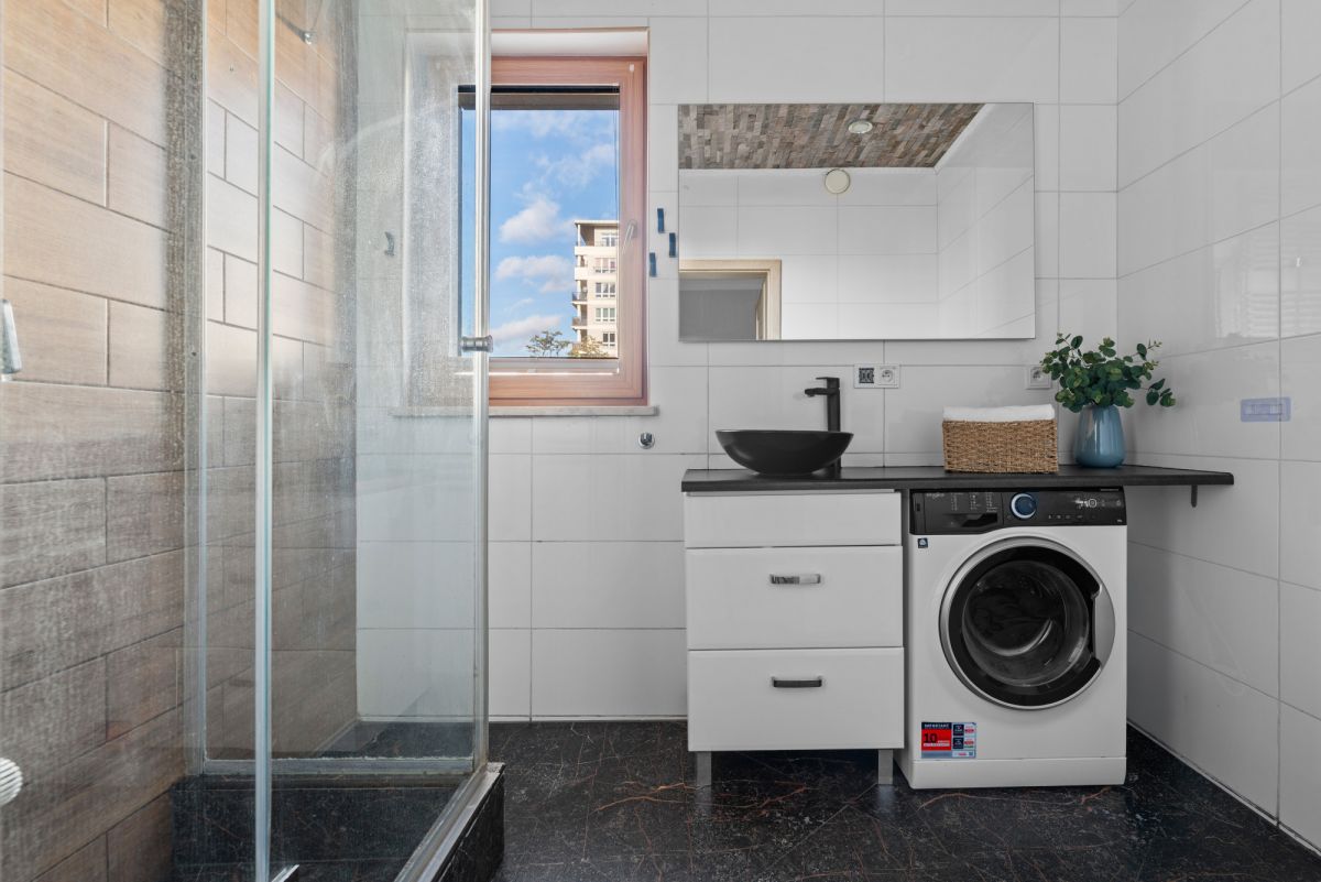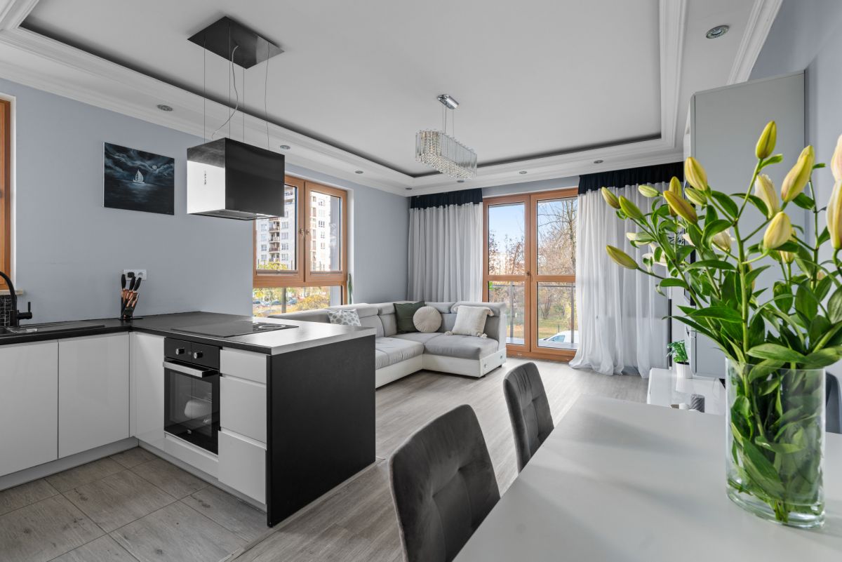 Jasne i funkcjonalne 3-pokojowe mieszkanie z balkonem, położone na 1. piętrze nowoczesnego budynku z 2018 roku przy ul. Rudnickiego, na zielonych Bielanach.