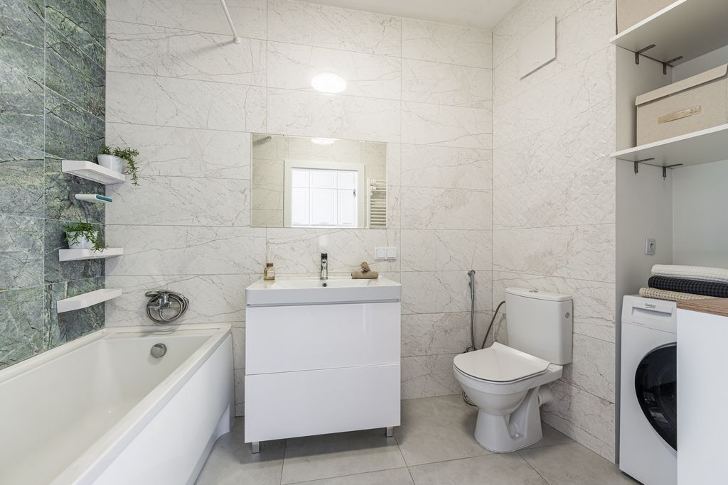 - pełne wyposażenie łazienki (wanna, pralka, umywalka, szafki)