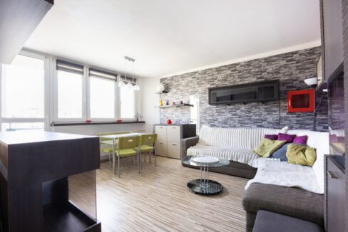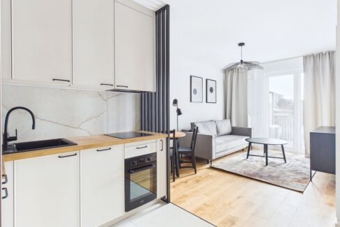 Salon z otwartą kuchnią i jadalnią umeblowany, główna sypialnia umeblowana, druga sypialnia (alternatywnie gabinet, pokój dziecka/nastolatka lub pokój gościnny) umeblowana, w tym zabudowa stała szaf ściennych na wymiar, telewizor na zapytanie najemcy.