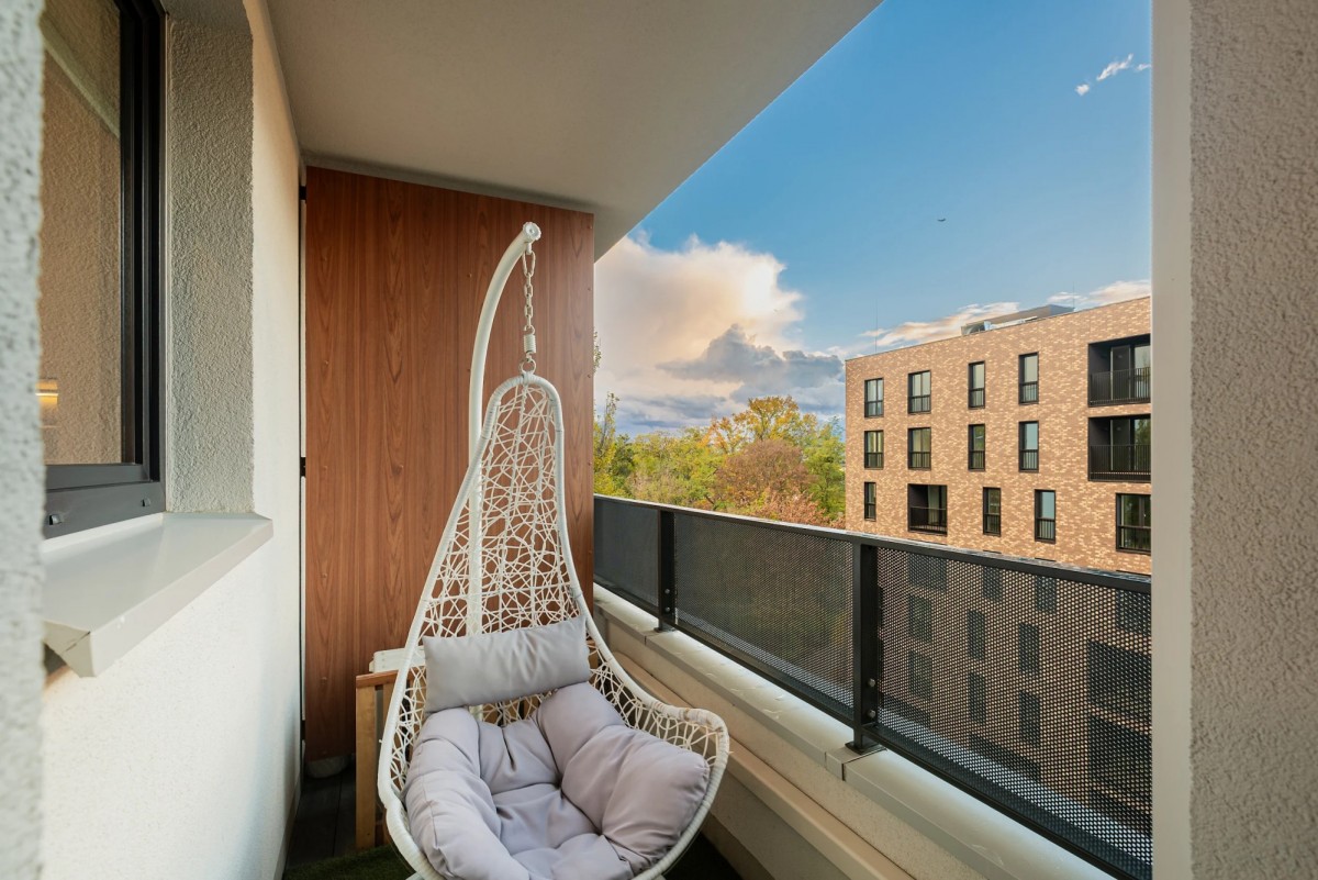 Z salonu wyjście na komfortową loggię, z widokiem na zachód słońca, idealną na poranną kawę lub spokojny wieczór z winem.