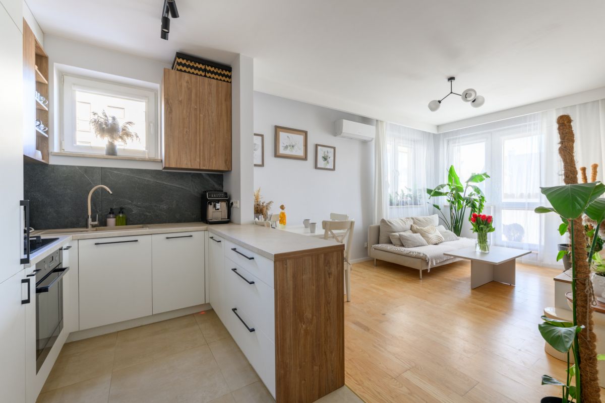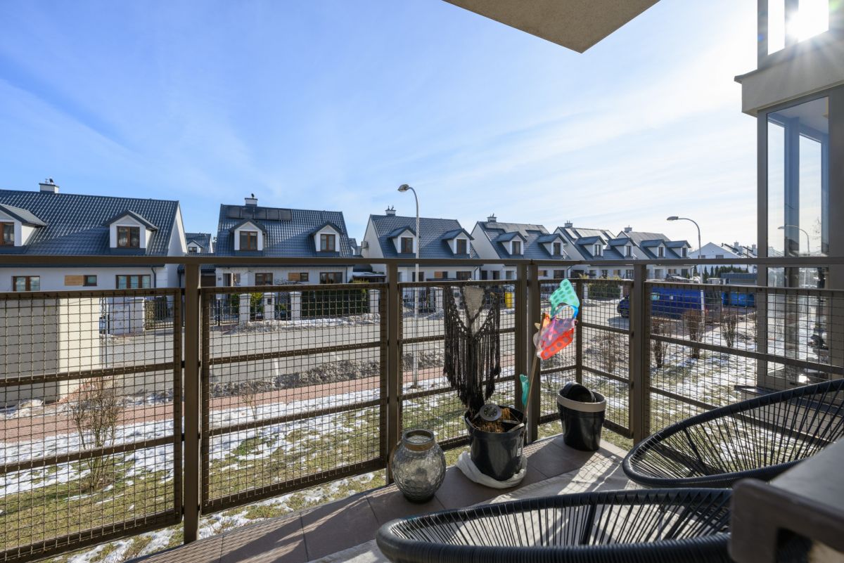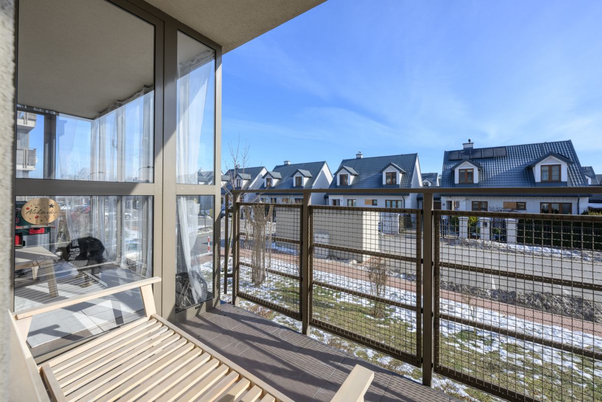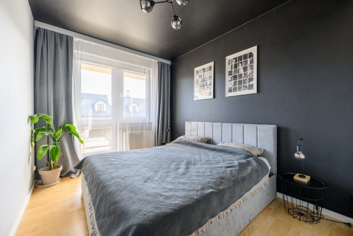 Lokal znajduje się na wysokim parterze w kameralnym, dwupiętrowym budynku na zamkniętym i monitorowanym osiedlu z całodobową ochroną. Mieszkanie o ekspozycji północno-wschodniej składa się z przestronnego salonu z aneksem kuchennym oraz dwóch ustawnych sypialni. Do dyspozycji są balkony, w tym jeden narożny, które zapewniają dodatkową przestrzeń i możliwość relaksu na świeżym powietrzu.Wnętrze jest zadbane i gotowe do wprowadzenia – lokal był odświeżany w 2024 roku, a zainstalowana klimatyzacja zapewnia komfort przez cały rok. Dużym atutem jest dodatkowe pomieszczenie pełniące funkcję garderoby/spiżarni, z możliwością przekształcenia w drugą łazienkę, co daje szerokie możliwości aranżacyjne, oraz liczne szafy w zabudowie, które zapewniają dużo miejsca do przechowywania.