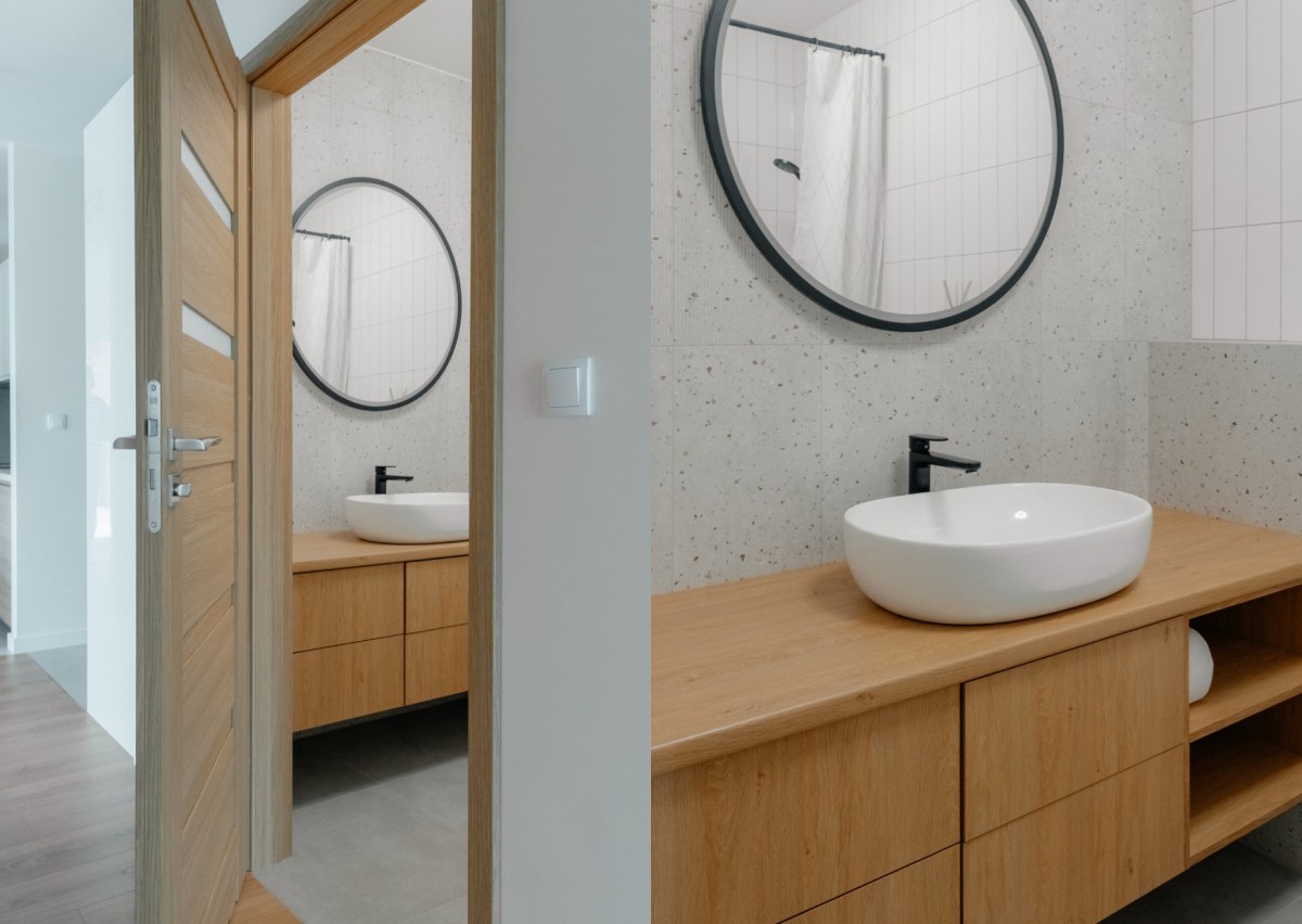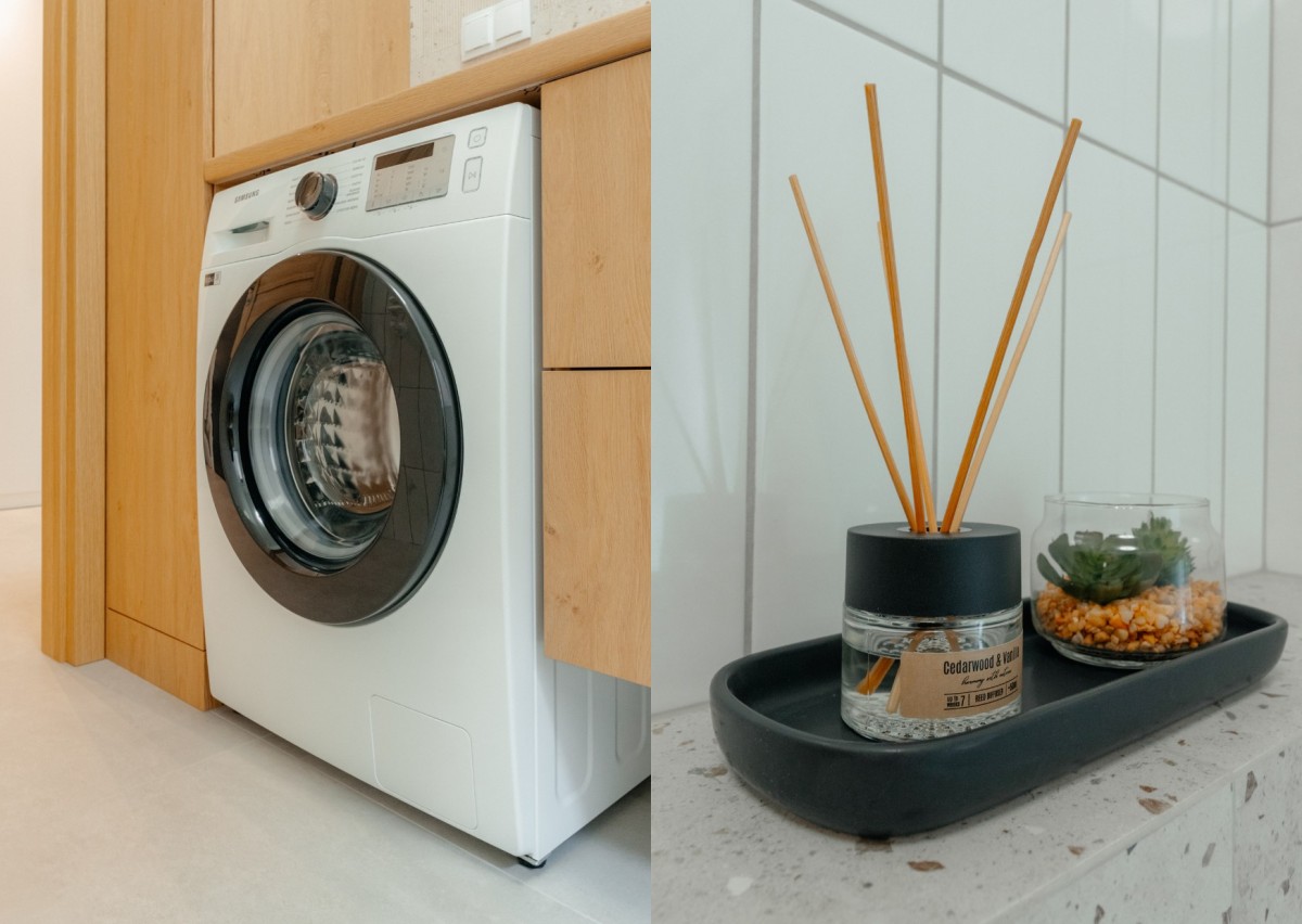 Lazienka 1 [3,5 m2] pralką, umywalką z lustrem i szafkami.