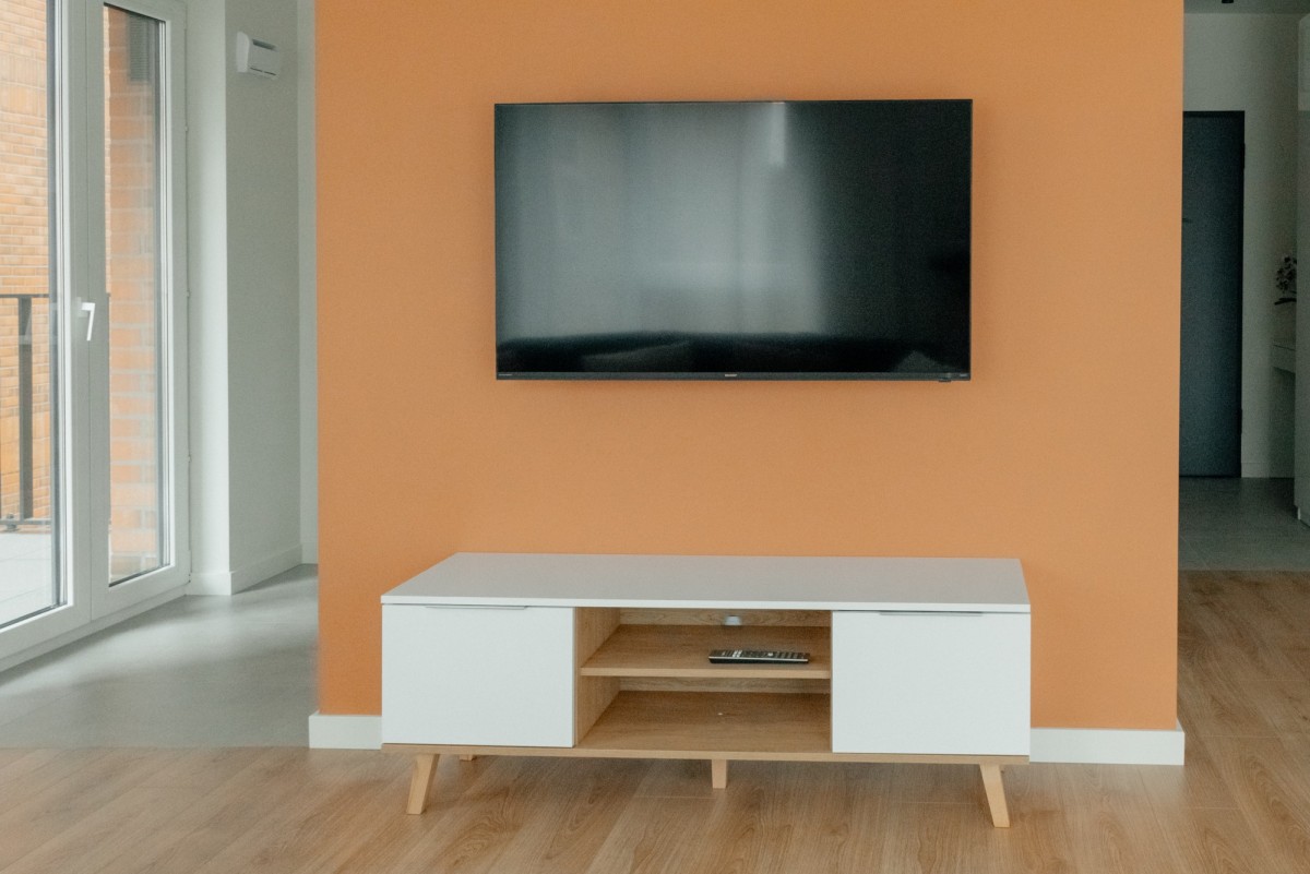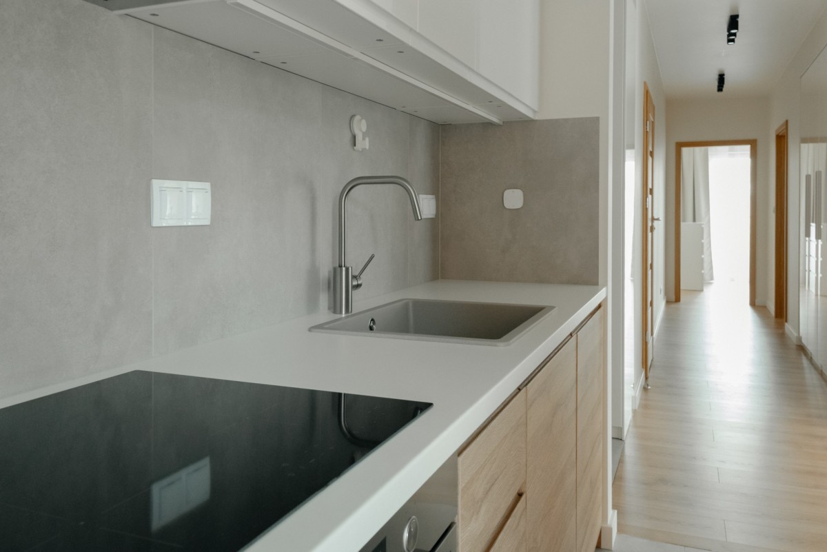 Kuchnia wyposażona w płytę indukcyjną, piekarnik, lodówkę, zmywarkę. Kuchnia połączona jest z salonem. W saloni są wygodna sofa, stól z czterma krzeslami, szafka pod telewizor, telewizor, stolik kawowy.