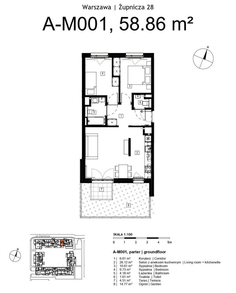 EU – użytkową (kWh/m2*rok): 50.77; EK – końcową (kWh/m2*rok): 78.48; EP – nieodnawialną energię pierwotną (kWh/m2*rok): 67.51; EC02 – Wielkość emisji CO2 (t C02/m2*rok): 0.03; UOZE – Udział odnawialnych źródeł energii w zapotrzebowaniu na energię końcową [%]: 0.00; The 58.86 sq. meter apartment is located in Warsaw’s Kamionek – at ul. Żupnicza 28, in the Praga-Południe district. It is a functional, 3-room, two-sided apartment with a garden of almost 15 m² . The premises have been finished to a turnkey standard, are partially furnished and ready to move in immediately.