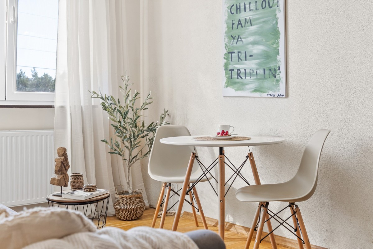 • przestronny salon z aneksem kuchennym (zmywarka, lodówka, piekarnik, okap), kanapa i stolik jadalniany