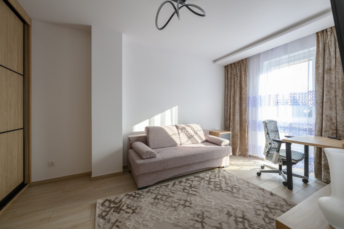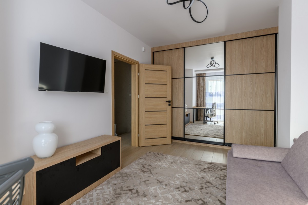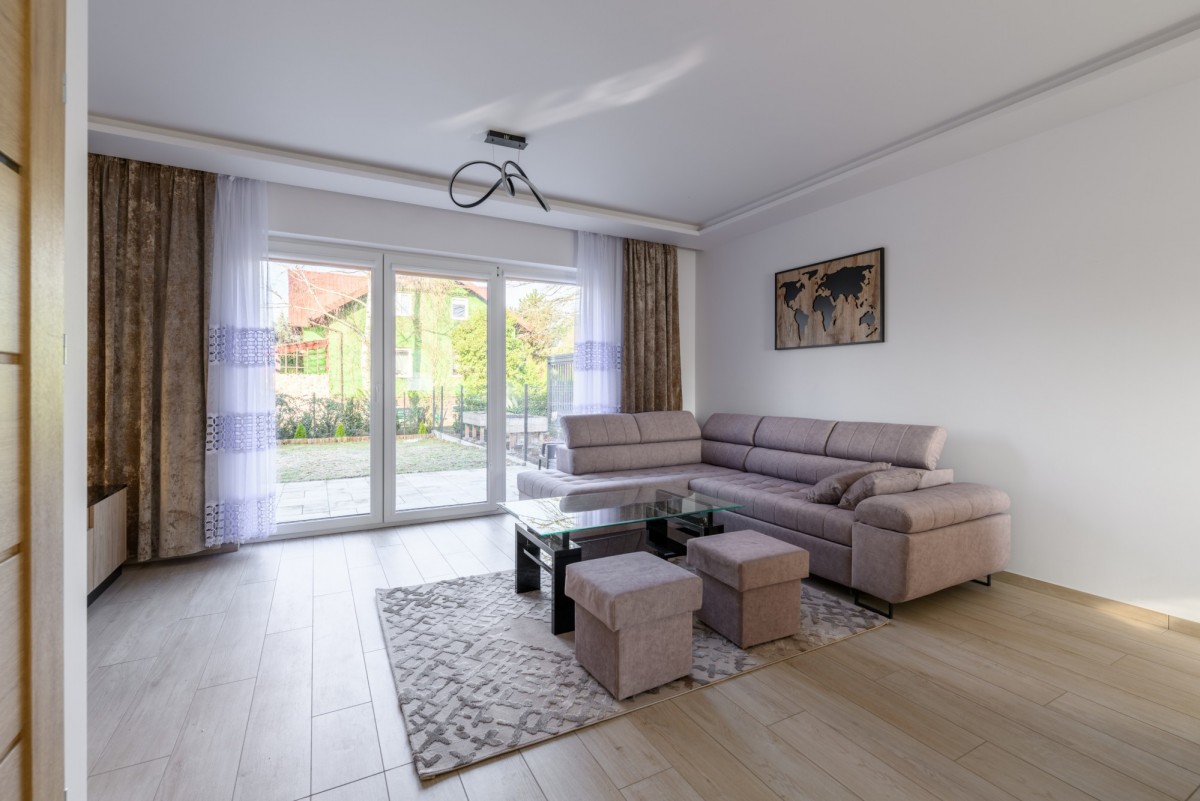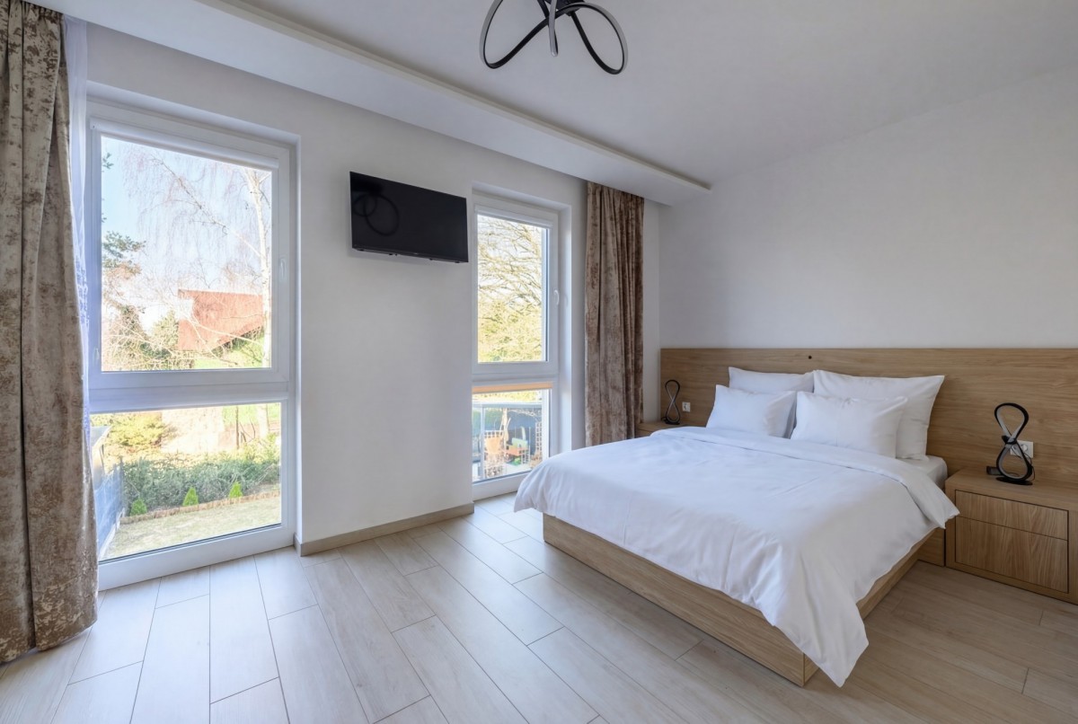 Mieszkanie jest umeblowane i kompleksowo wyposażone. Nieruchomość posiada klimatyzację na obydwu kondygnacjach. W salonie znajduje się wygodna kanapa ze stolikiem kawowym oraz telewizor, a kuchnia została wyposażona w pełną zabudowę i sprzęty AGD m.in. mikrofalówkę, piekarnik, zmywarkę. Główna sypialnia posiada ramę łóżka (bez materaca – najemca dobiera go we własnym zakresie – wymiary materaca 160×200) oraz pojemną szafę w zabudowie i telewizor, natomiast druga sypialnia oferuje rozkładaną kanapę, dużą szafę w zabudowie, biurko do pracy oraz szafkę RTV. W wyposażeniu znajdują się także liczne akcesoria domowe, m.in. odkurzacz, mop z wiadrem, żelazko, deska do prasowania, czajnik, pralka, suszarka, kosiarka oraz meble tarasowe do ogrodu.
