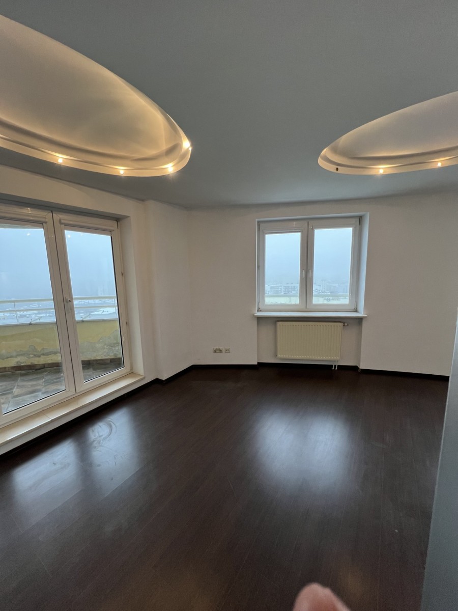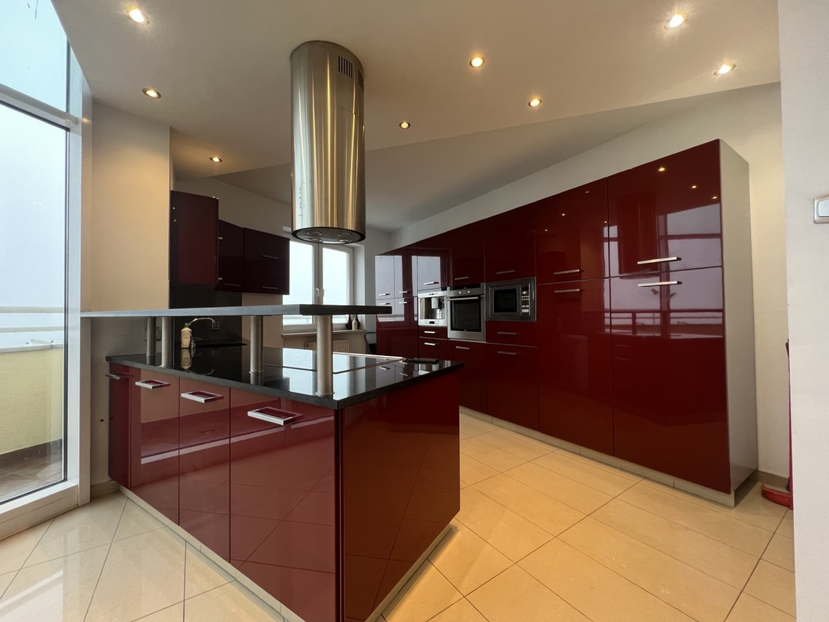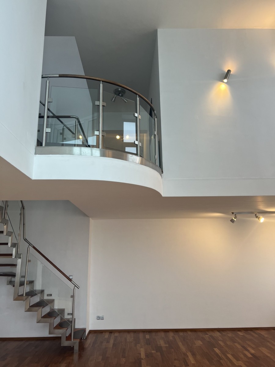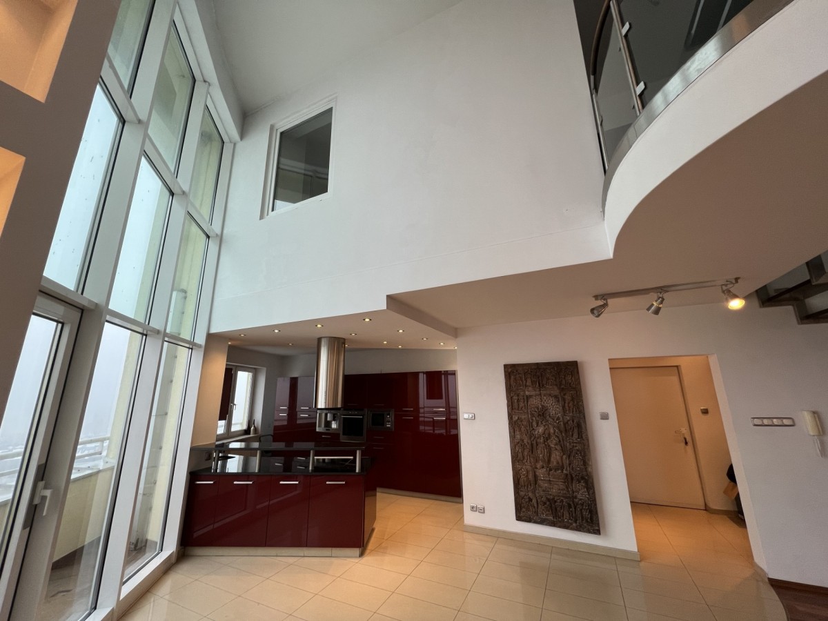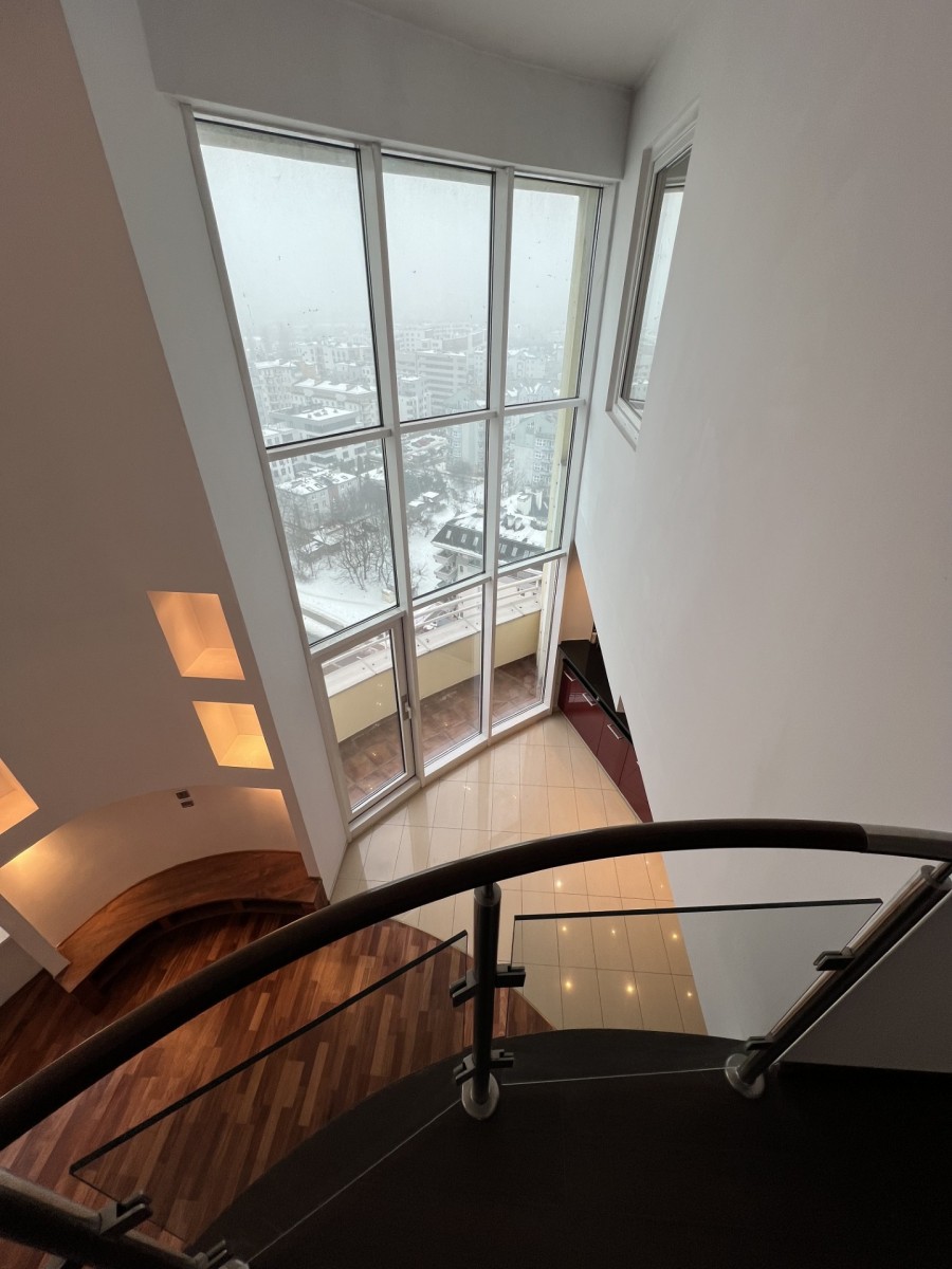 Trzy poziomowy, z trzema balkonami i dużym tarasem (56m) na trzecim poziomie (wysokość 17piętra).
