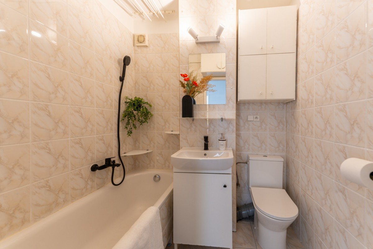Utrzymana w jasnej, kremowej kolorystyce z wanną, umywalką i czarnymi nowoczesnymi akcentami, które nadają wnętrzu charakter.