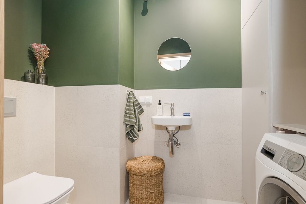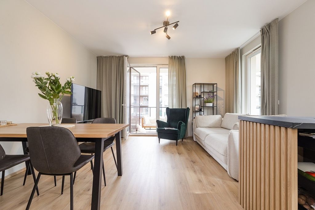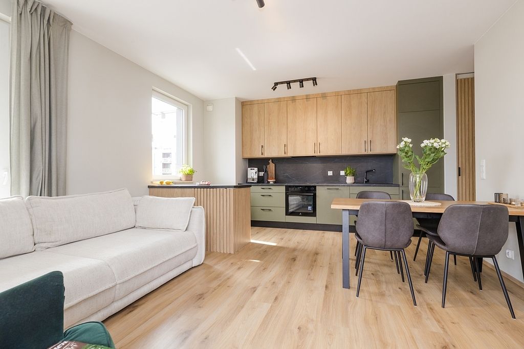 W salonie, dzięki dużym oknom, jest bardzo widno, co sprawia, że przestrzeń wydaje się jeszcze większa. Aneks kuchenny z salonem w połączeniu ze stonowanymi barwami i eleganckimi akcentami w kolorze oliwkowej zieleni, tworzy harmonijne i przytulne wnętrze.