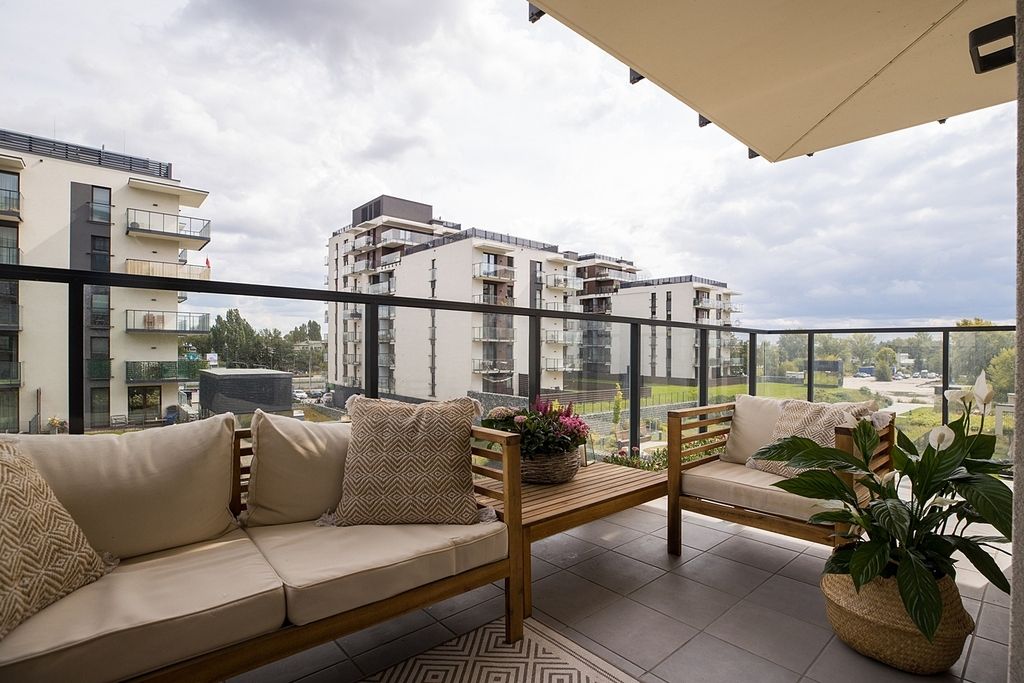 – dwa balkony, w tym jeden duży, narożny z wyjściem z salonu, który został zaaranżowany jako strefa relaksu z meblami wypoczynkowymi.