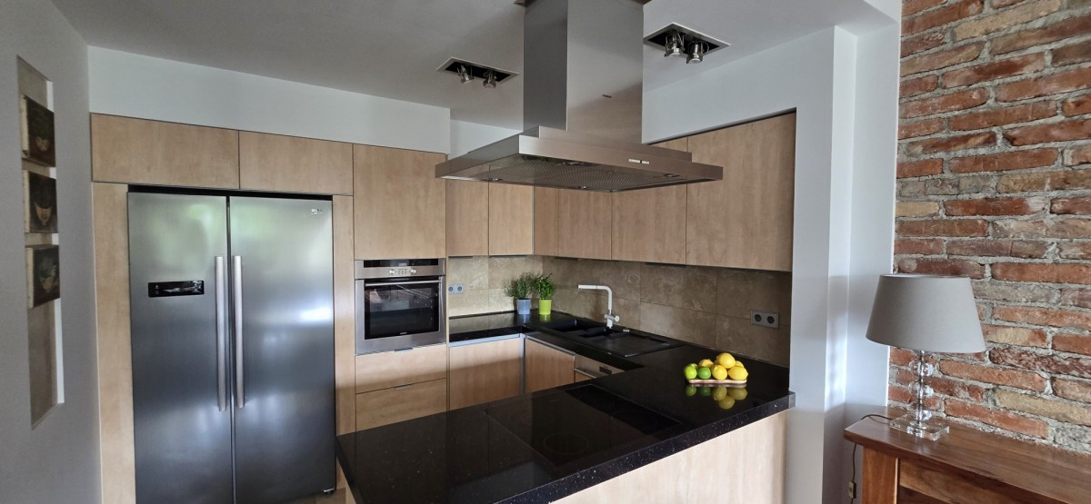 Salon z aneksem kuchennym – przestrzeń idealna do relaksu i wspólnych posiłków: dwie wygodne, eleganckie sofy, stół dla 4 osób, klimatyzacja, w pełni wyposażona kuchnia (lodówka, płyta elektryczna, piekarnik, blat roboczy, liczne szafki)