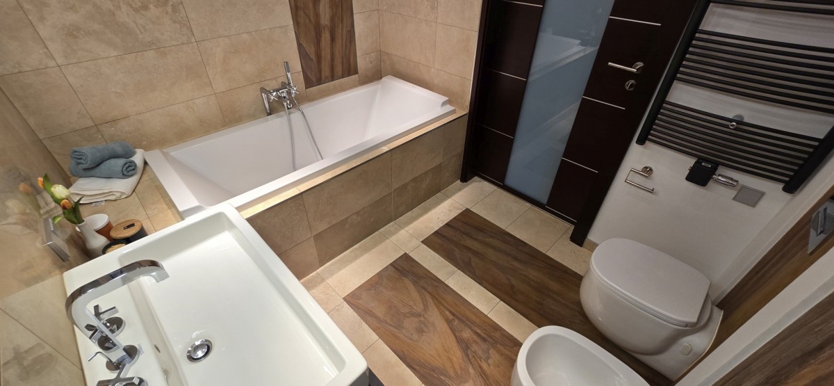 Dwie łazienki – pierwsza z wanną, bidetem i toaletą; druga z prysznicem, toaletą i pralką