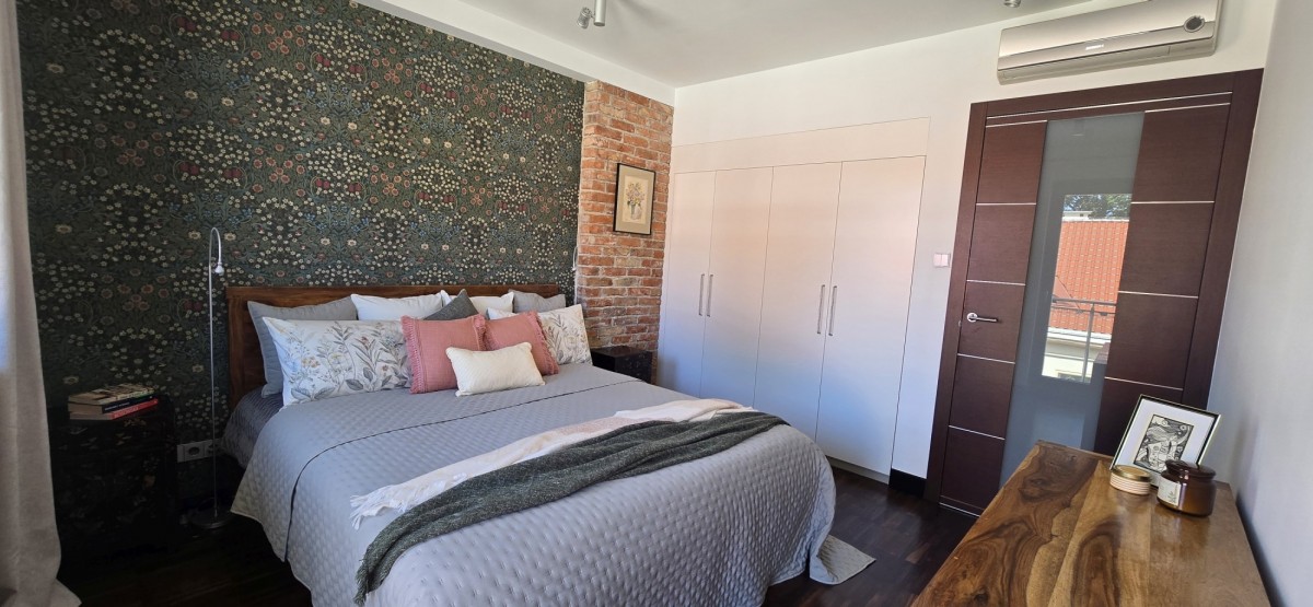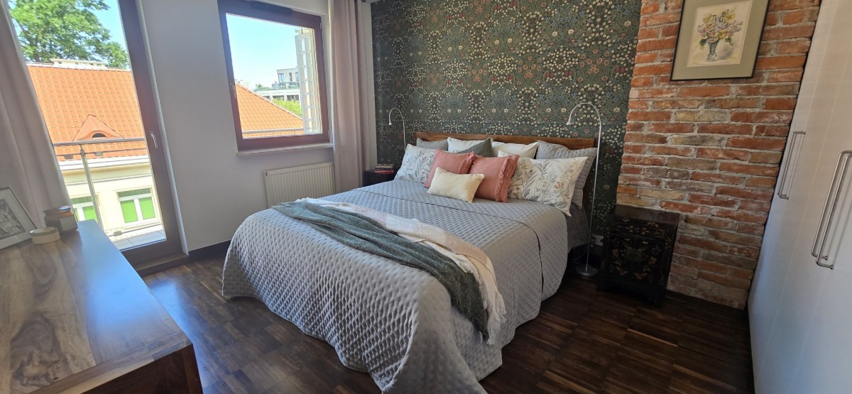 Sypialnia główna – podwójne łóżko, duża szafa w zabudowie, mnóstwo naturalnego światła, wyjście na balkon, klimatyzacja